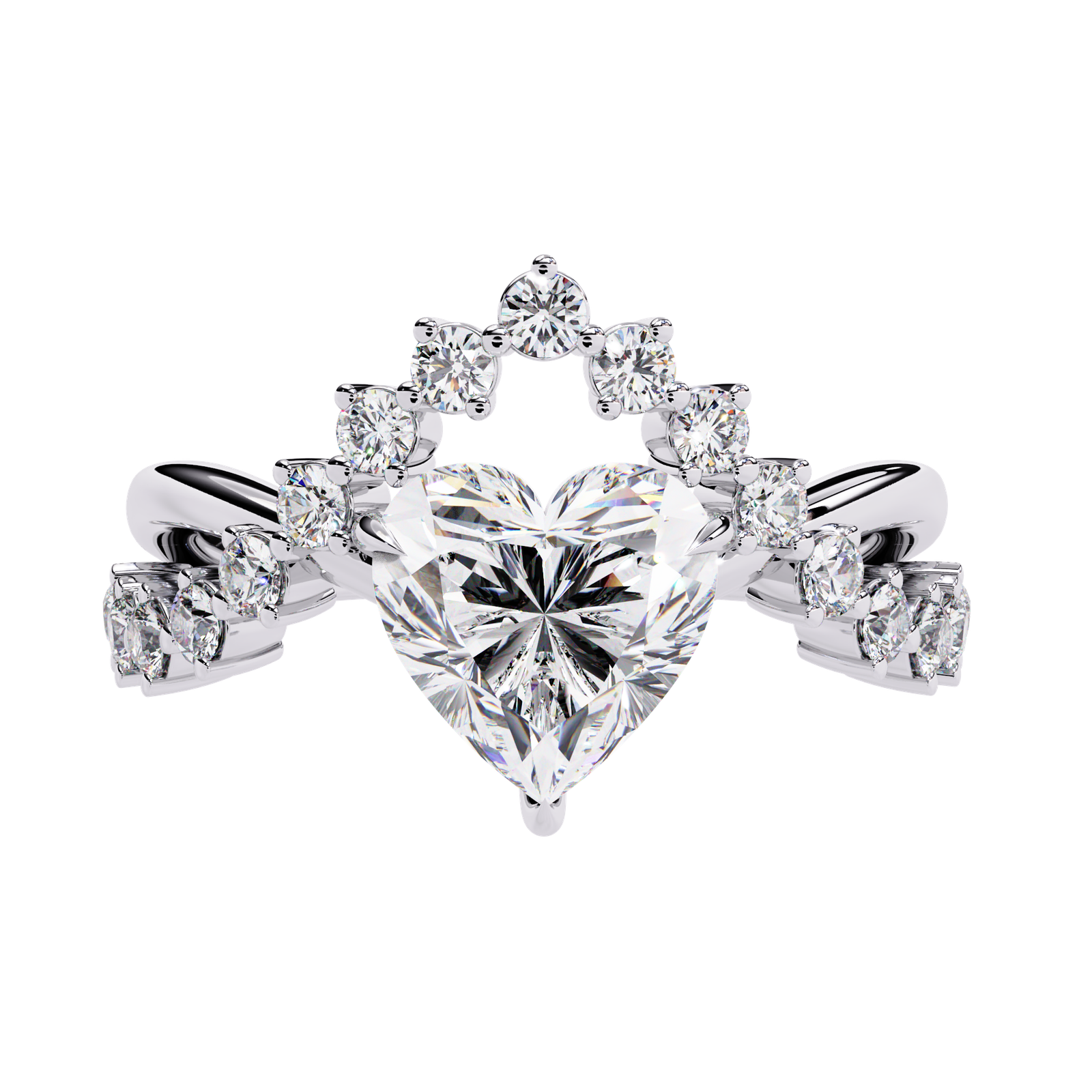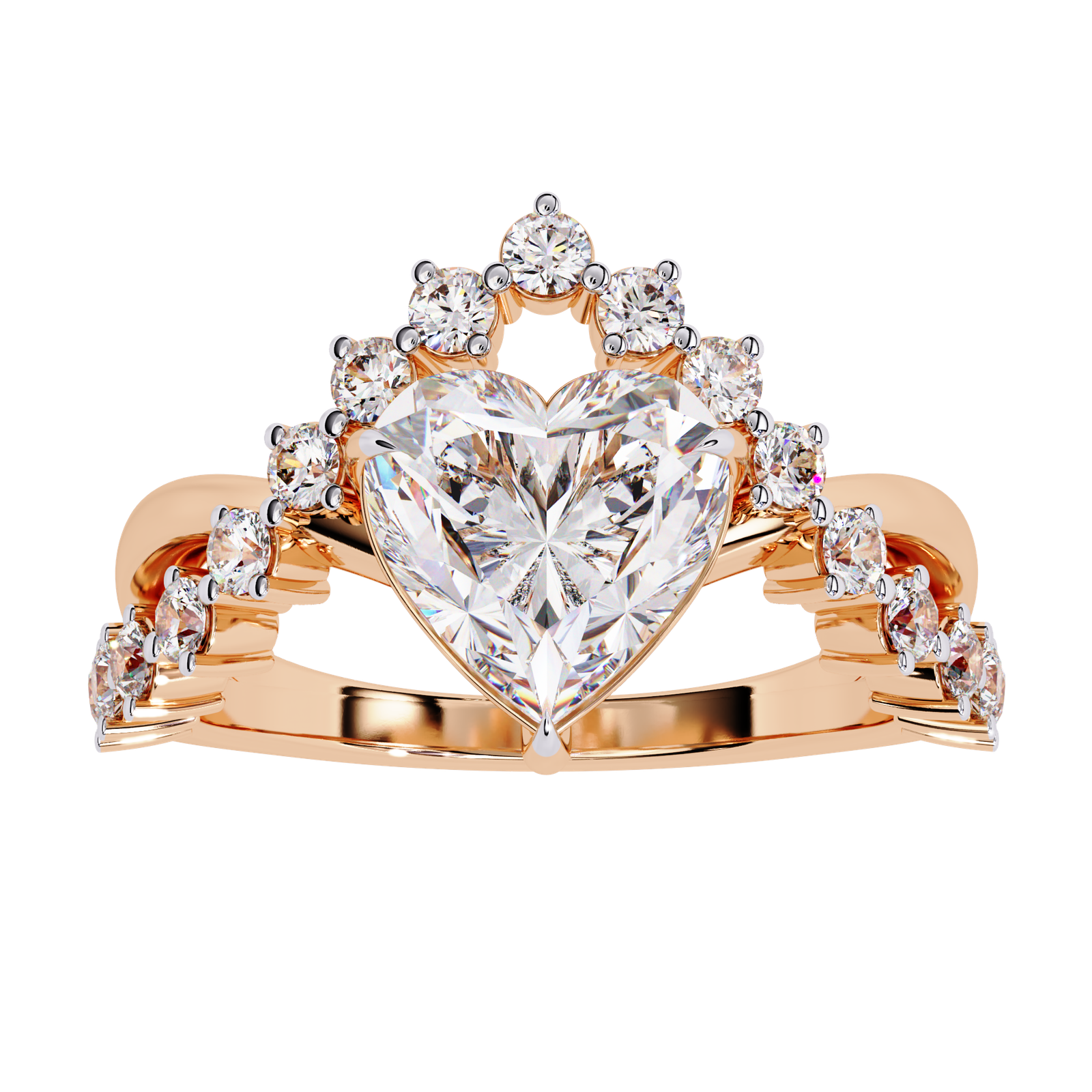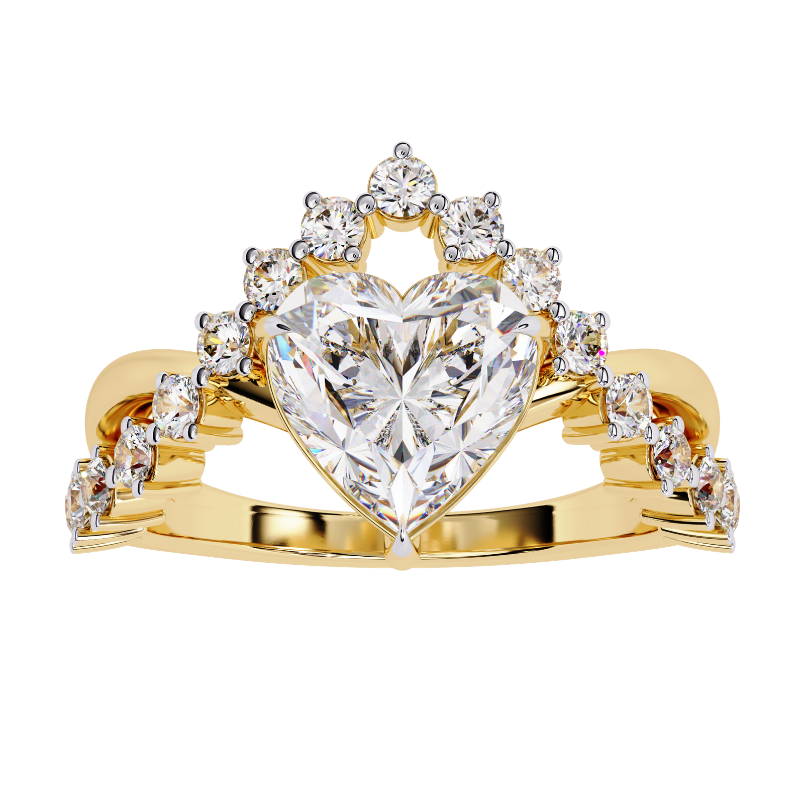 This exquisite gold ring features a brilliant heart-shaped diamond centerpiece, crowned with a tiara-like halo of round-cut diamonds. The intricate band sparkles with pavé-set stones, blending elegance and royalty. Perfect for engagements or special occasions, it symbolizes love, devotion, and timeless grace in a majestic design.