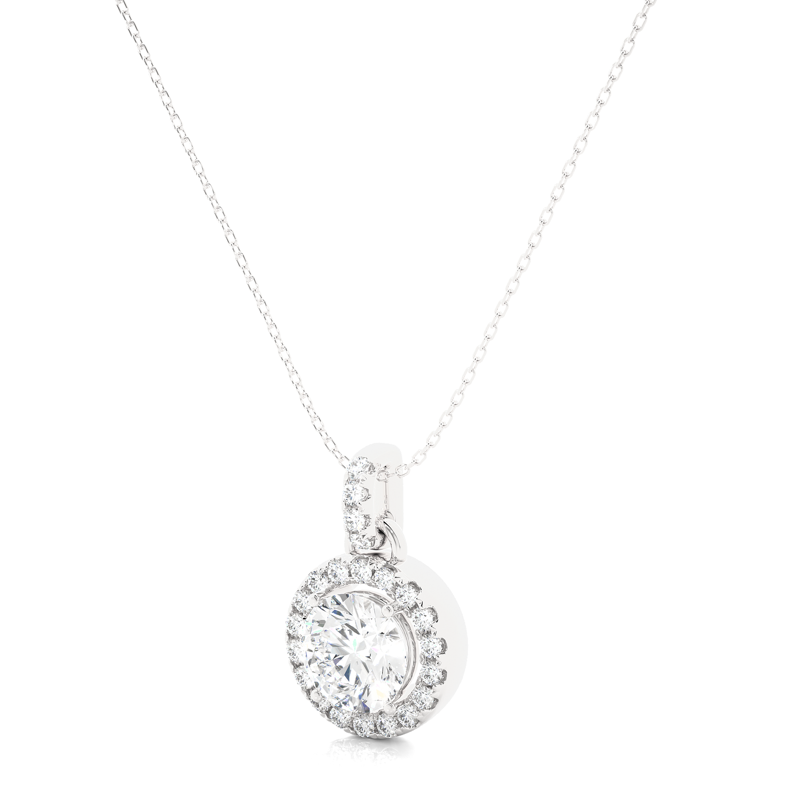 This exquisite solid gold pendant features a dazzling center diamond surrounded by a halo of smaller diamonds, enhancing its brilliance. Suspended from a delicate chain with diamond accents, it offers timeless elegance and sparkle. Perfect for adding a touch of luxury to any outfit or special occasion.