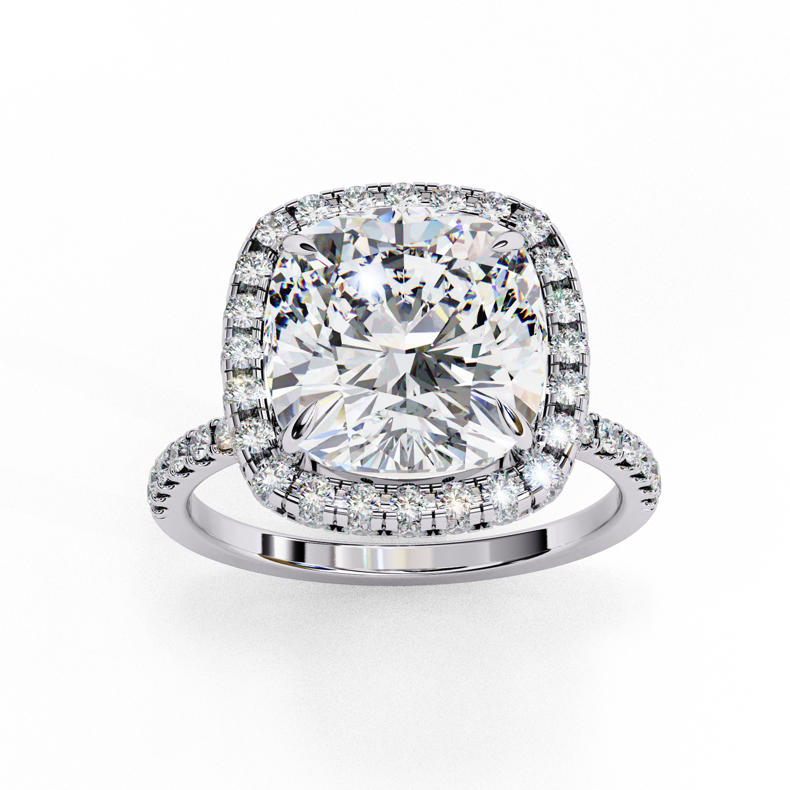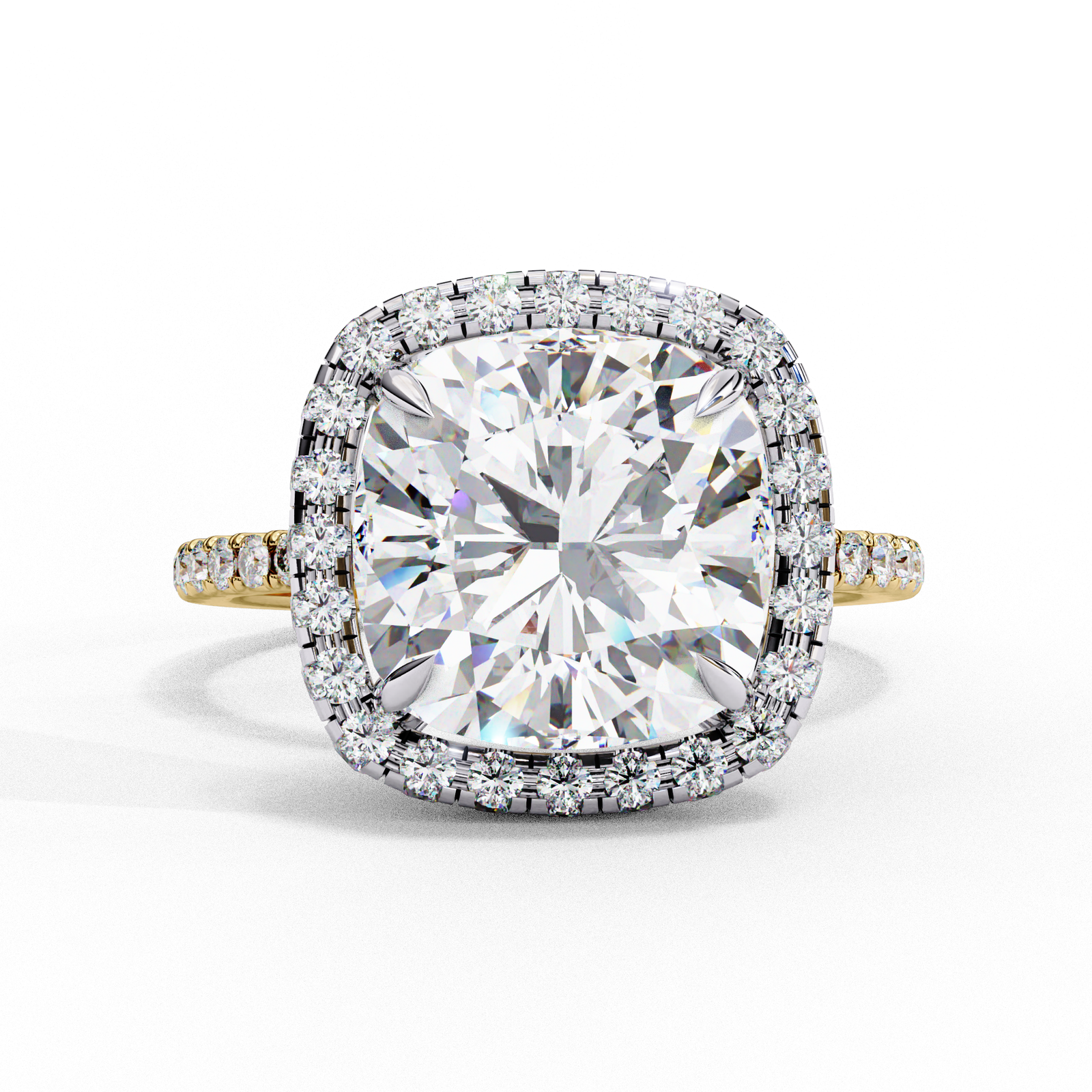 This stunning ring features a brilliant cushion-cut center diamond, encircled by a dazzling halo of smaller diamonds for maximum sparkle. The gold band, adorned with delicate diamond accents, enhances its timeless charm. A perfect blend of elegance and radiance, it symbolizes everlasting love and makes an unforgettable engagement statement.