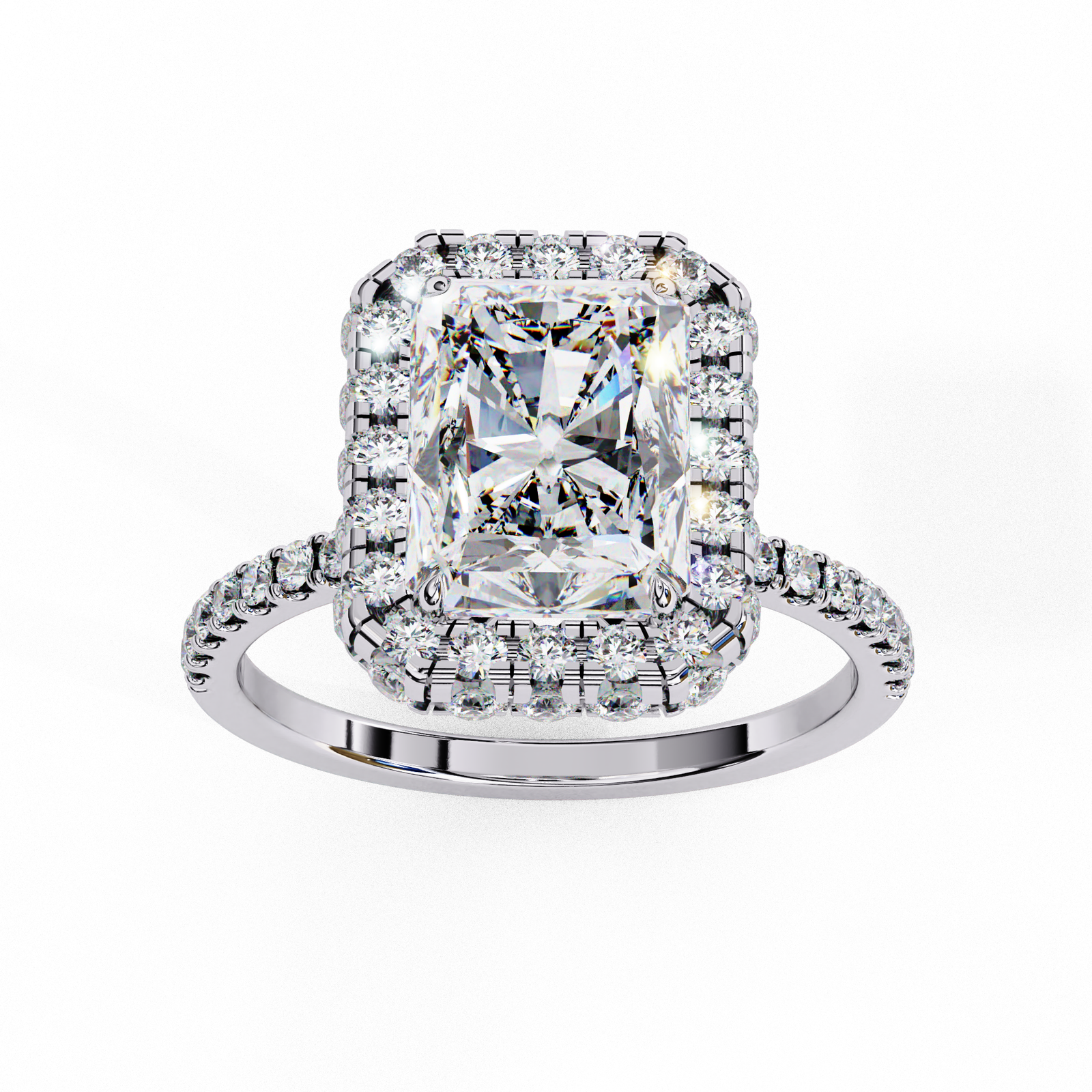 This breathtaking ring highlights a radiant-cut center diamond, beautifully framed by a shimmering halo of round diamonds. The pavé-set band enhances its brilliance, adding extra sparkle from every angle. Timeless yet modern, this design is a symbol of elegance, luxury, and everlasting love, making it ideal for engagements or milestones.