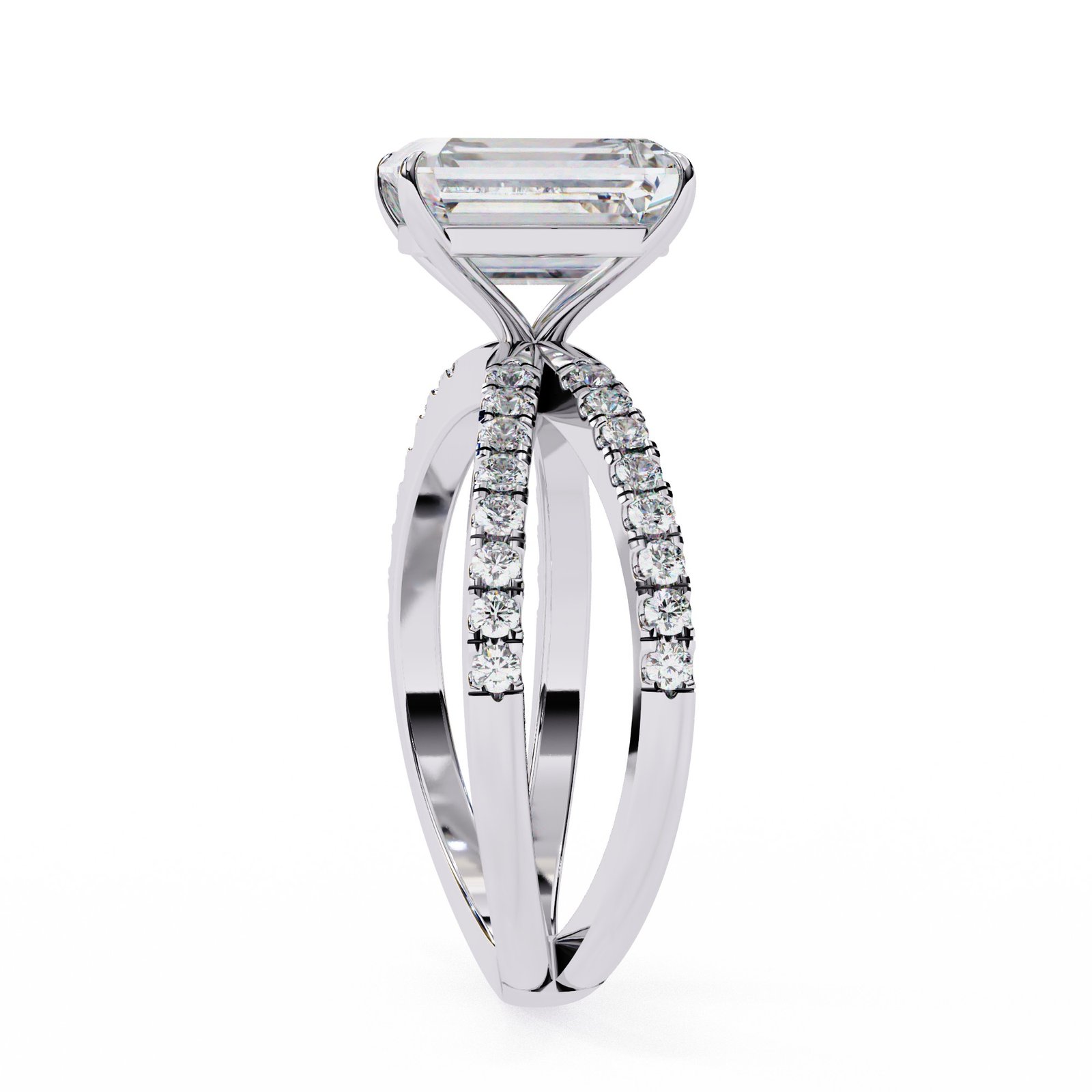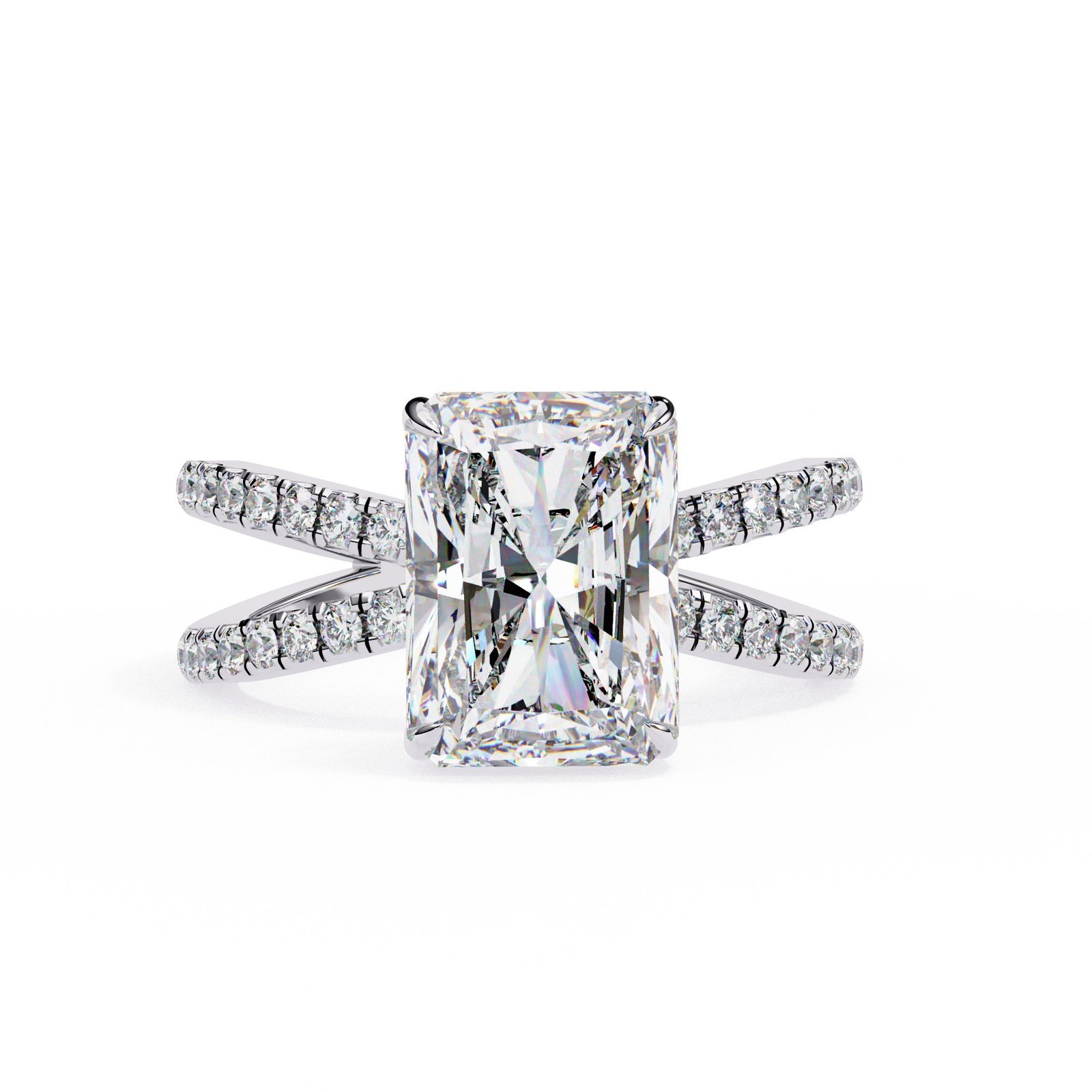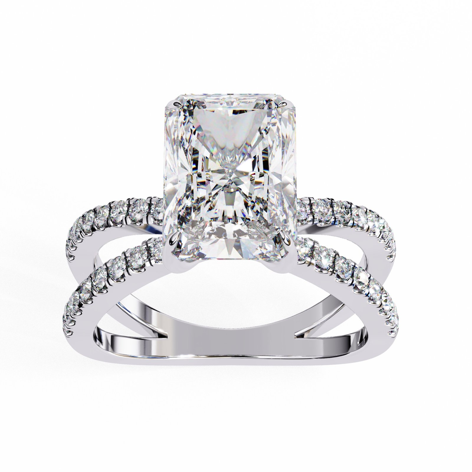 This radiant cut diamond ring features a dazzling center stone set atop a pavé diamond split shank in sleek white gold. The perfect blend of sparkle and sophistication, this design offers modern elegance with timeless appeal—ideal for those who love to stand out with grace.