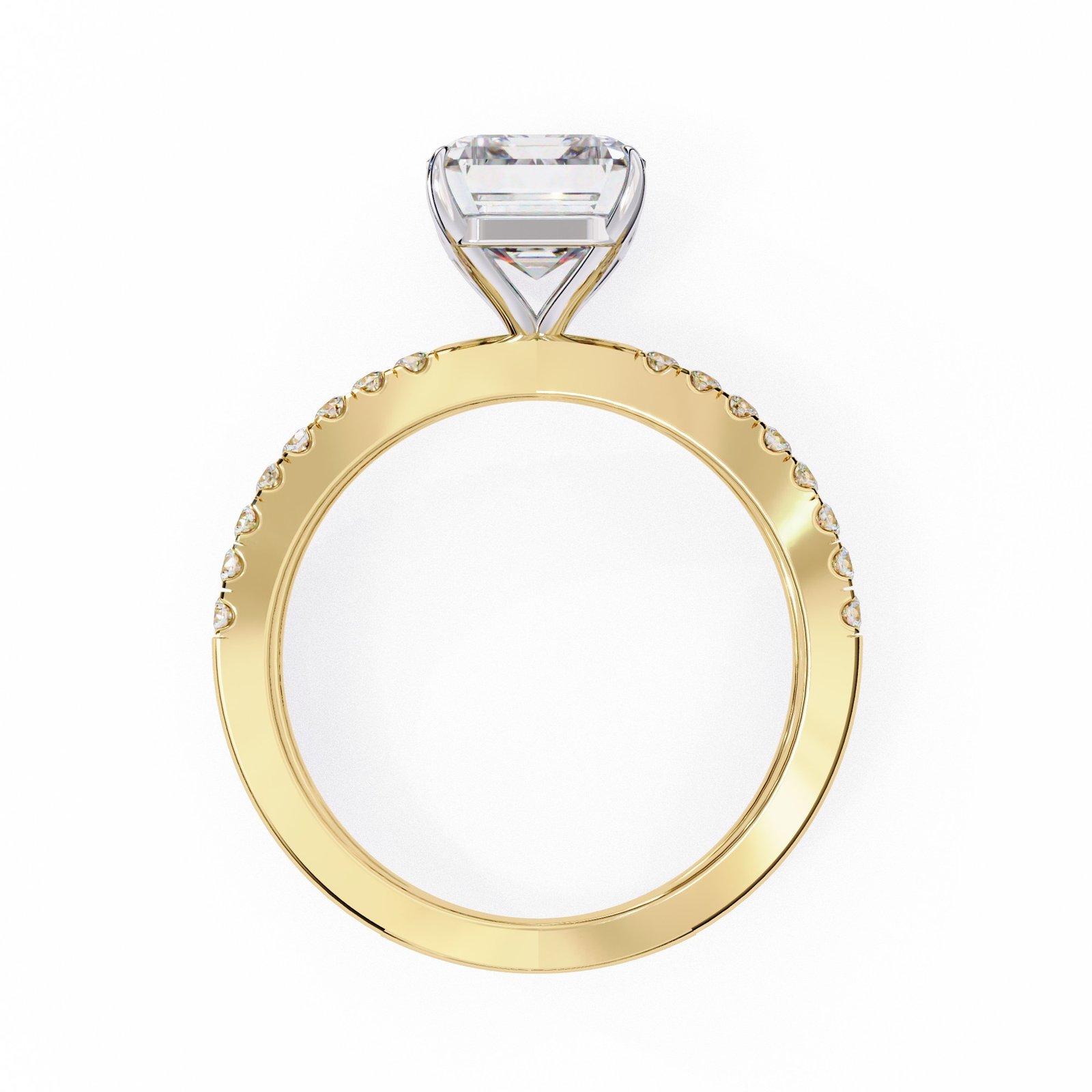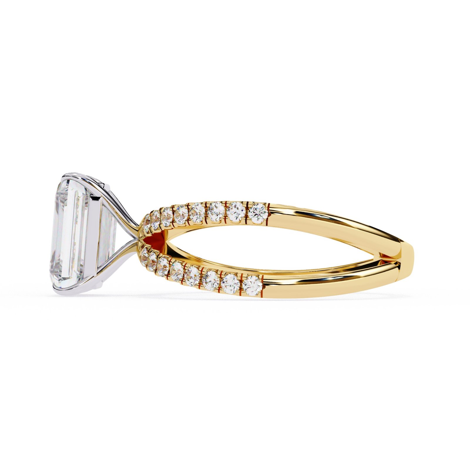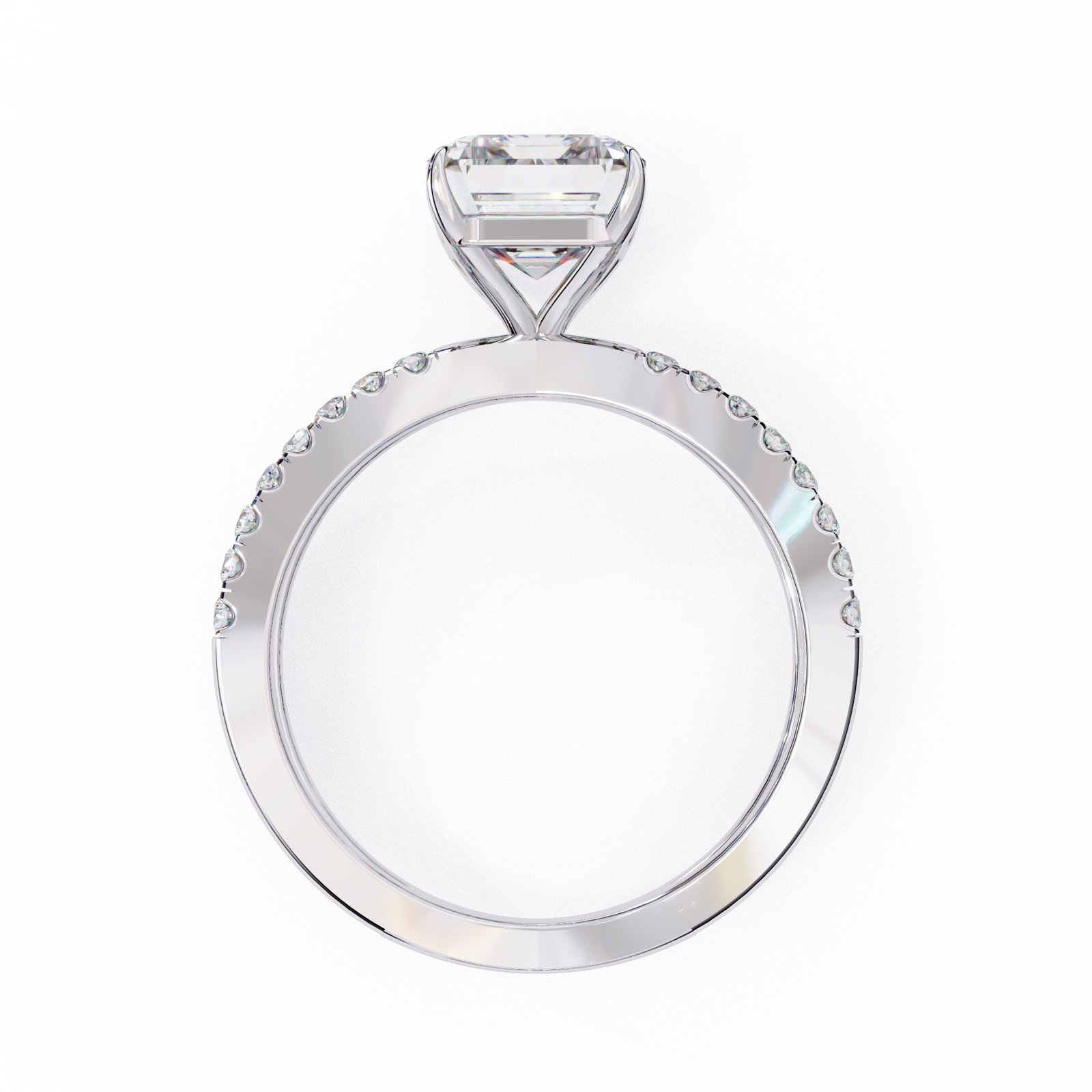 This radiant cut diamond ring features a dazzling center stone set atop a pavé diamond split shank in sleek white gold. The perfect blend of sparkle and sophistication, this design offers modern elegance with timeless appeal—ideal for those who love to stand out with grace.