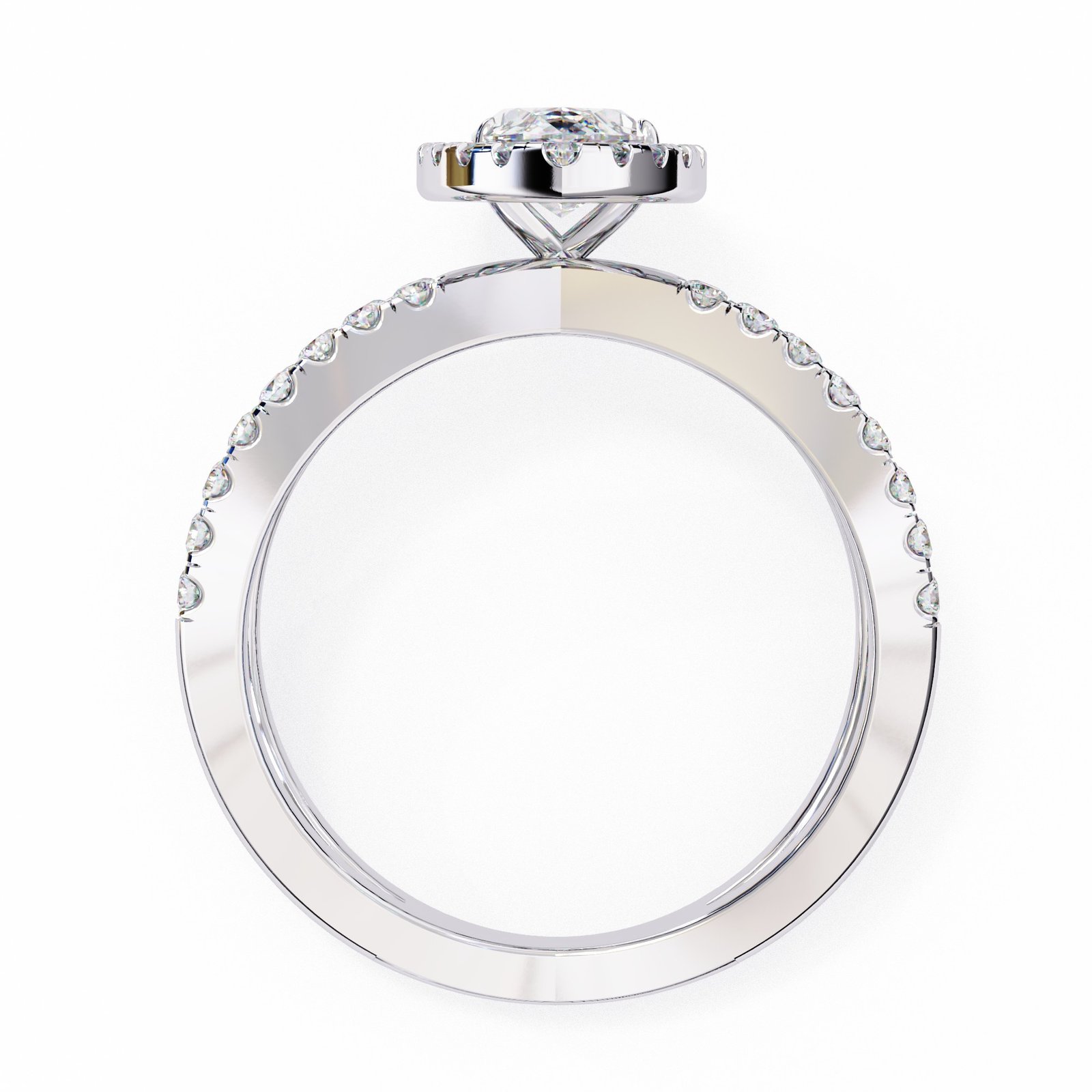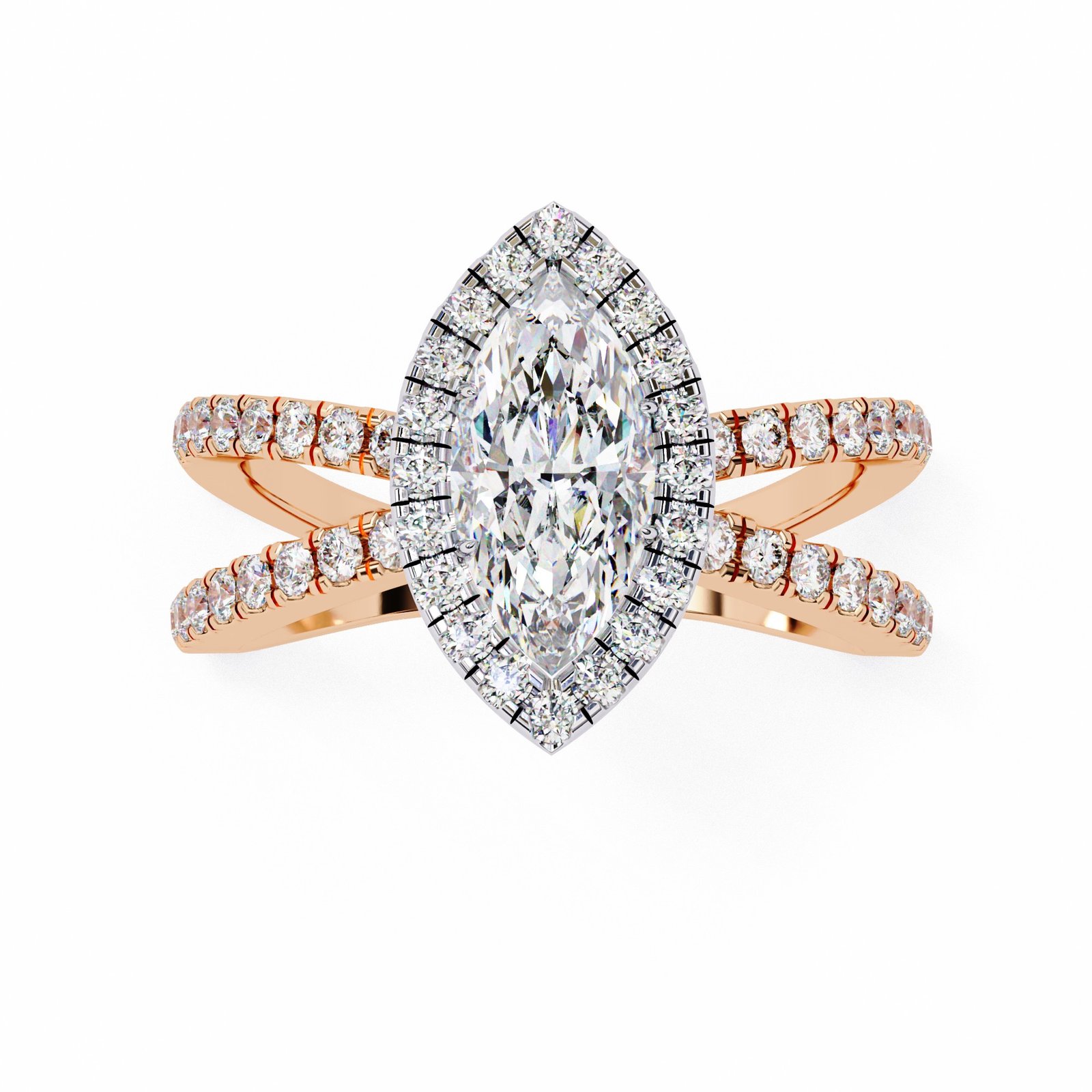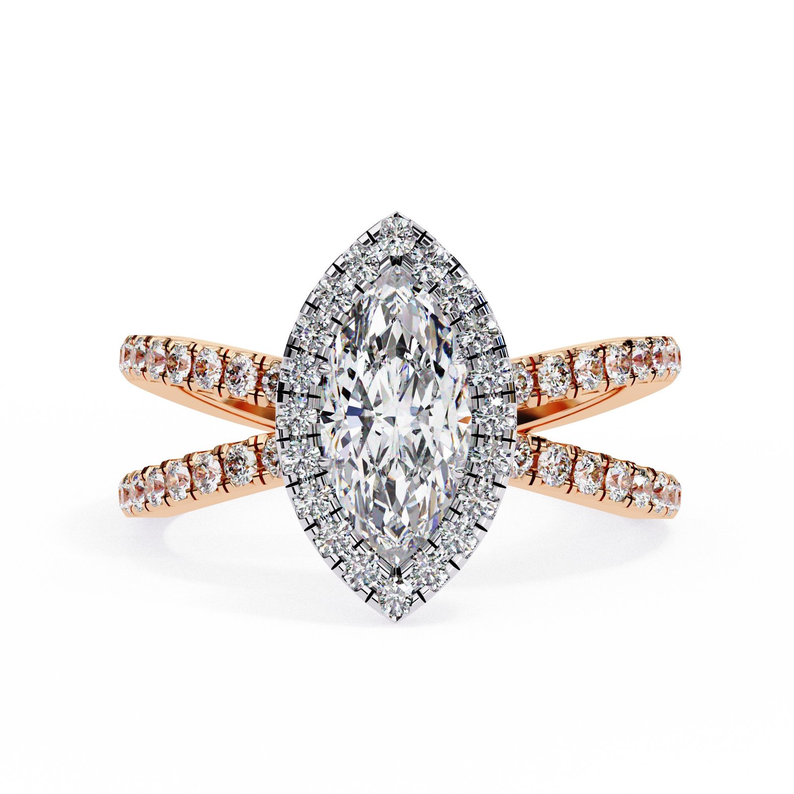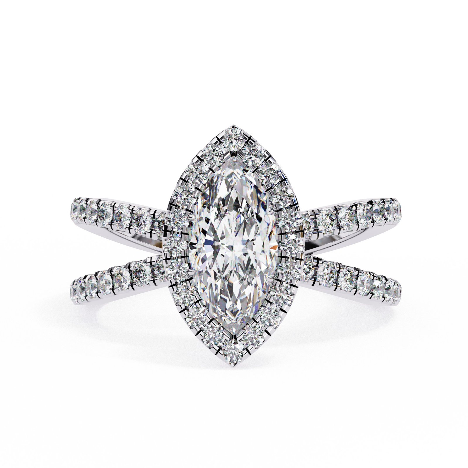This marquise-cut diamond ring features a dazzling halo of pavé-set diamonds that enhance its elongated brilliance. The split shank design, lined with shimmering stones, adds contemporary elegance. Set in lustrous white gold, this statement ring is perfect for those who desire a bold, sophisticated engagement or anniversary piece.