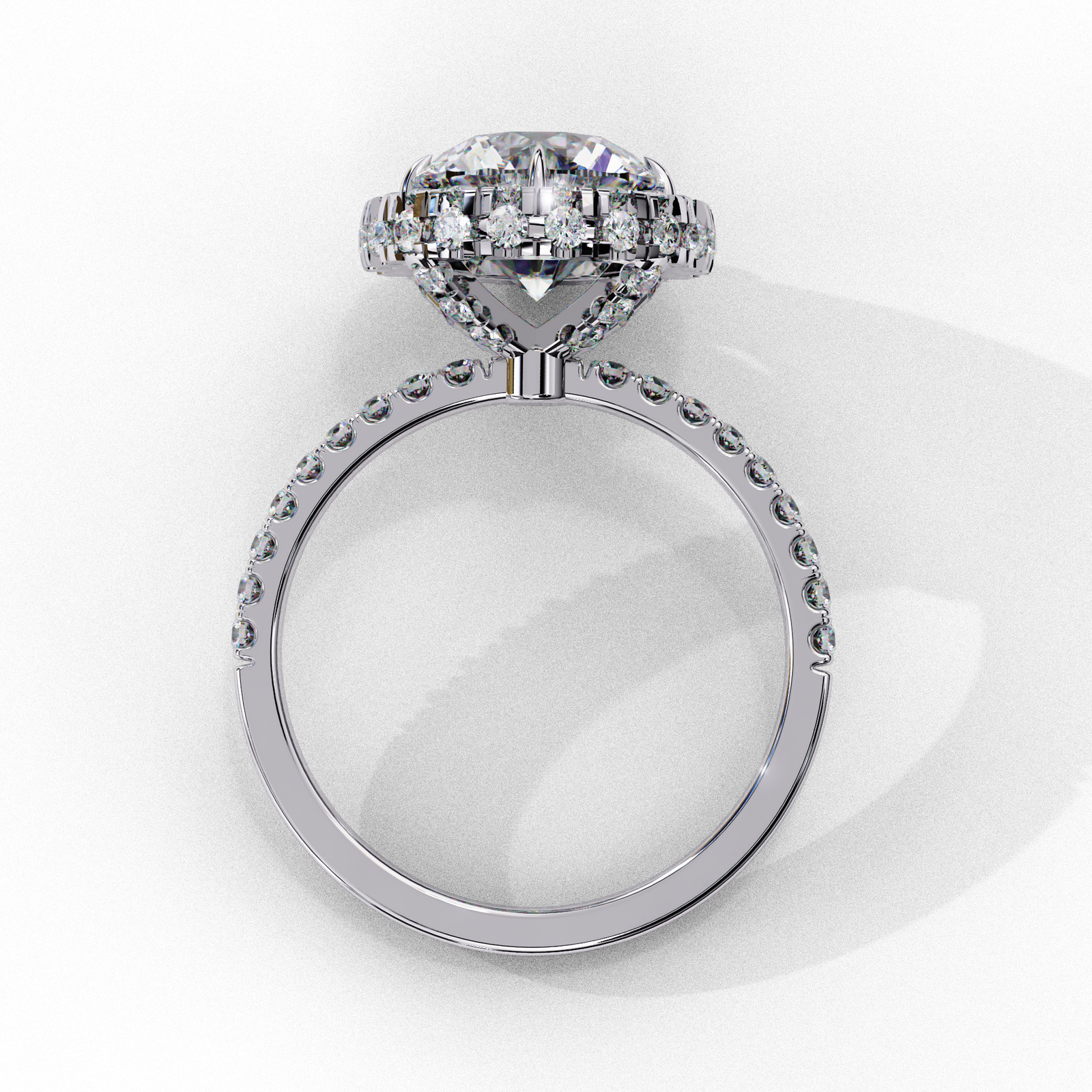 This elegant ring features a brilliant round-cut center diamond surrounded by a dazzling halo of smaller diamonds. The band is adorned with pavé-set diamonds, enhancing its sparkle and sophistication. Set in white gold or platinum, this timeless design combines classic beauty with modern glamour, perfect for a romantic engagement.