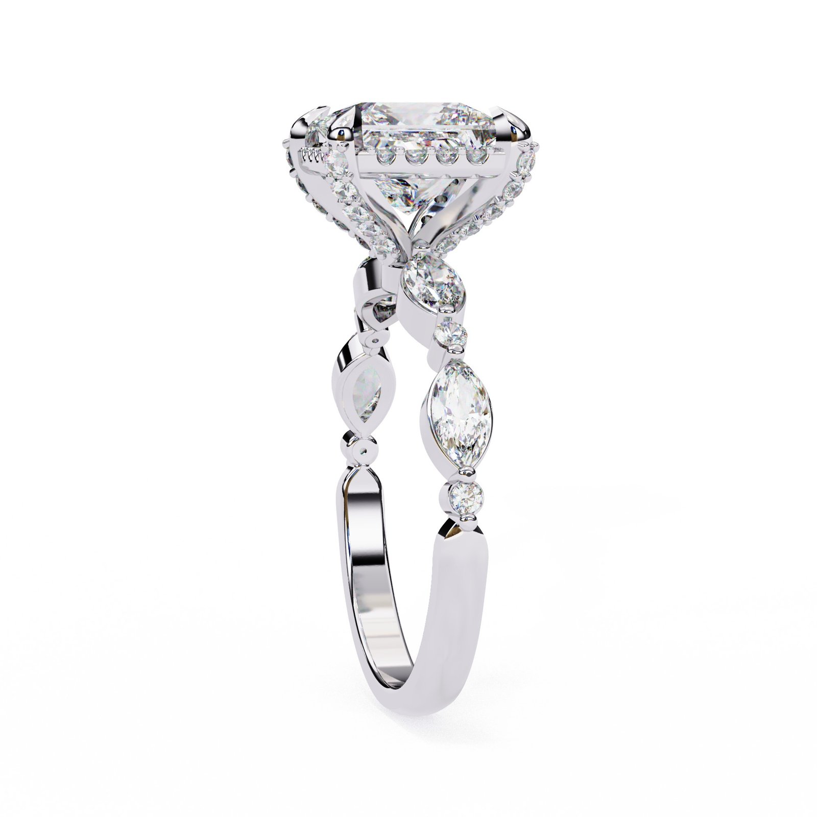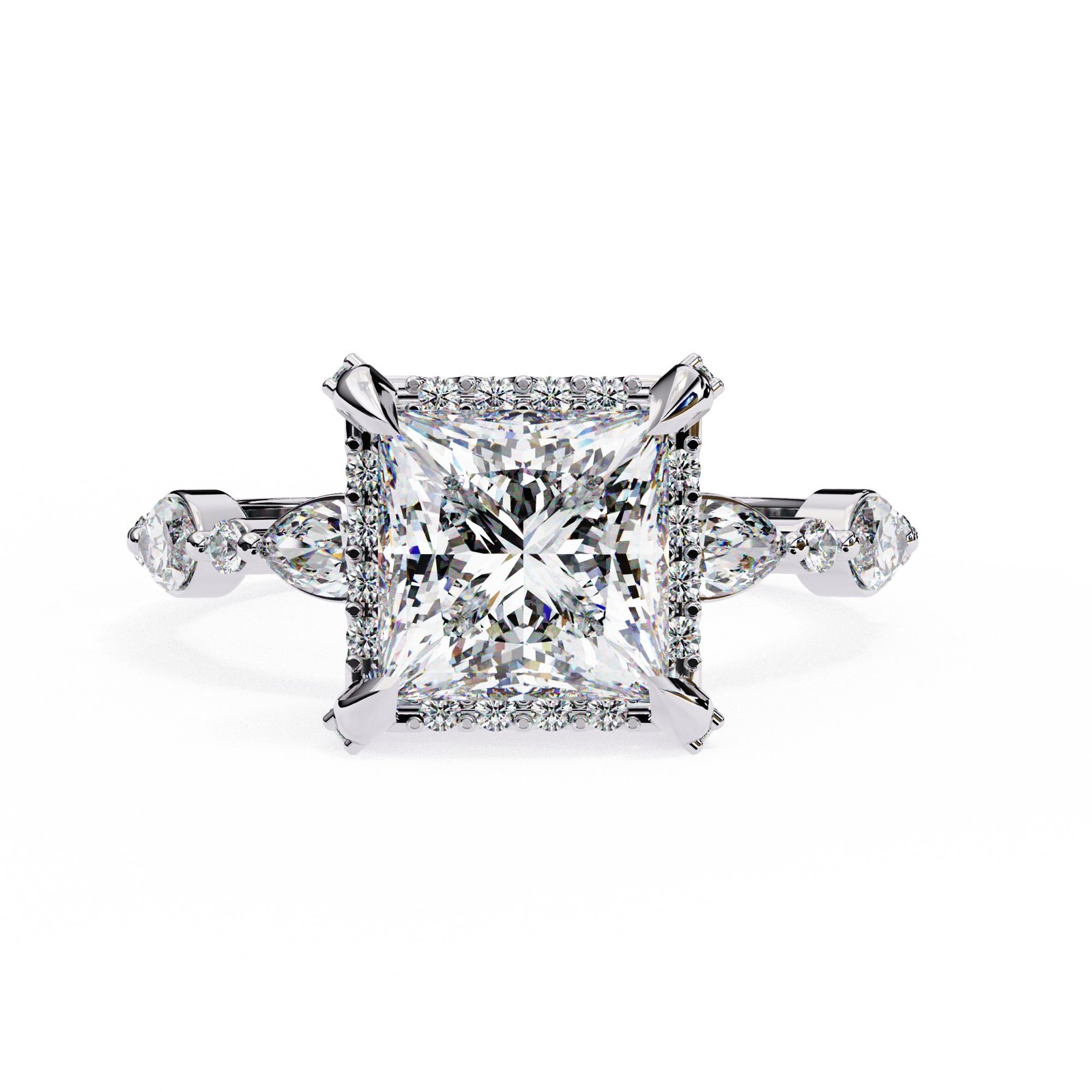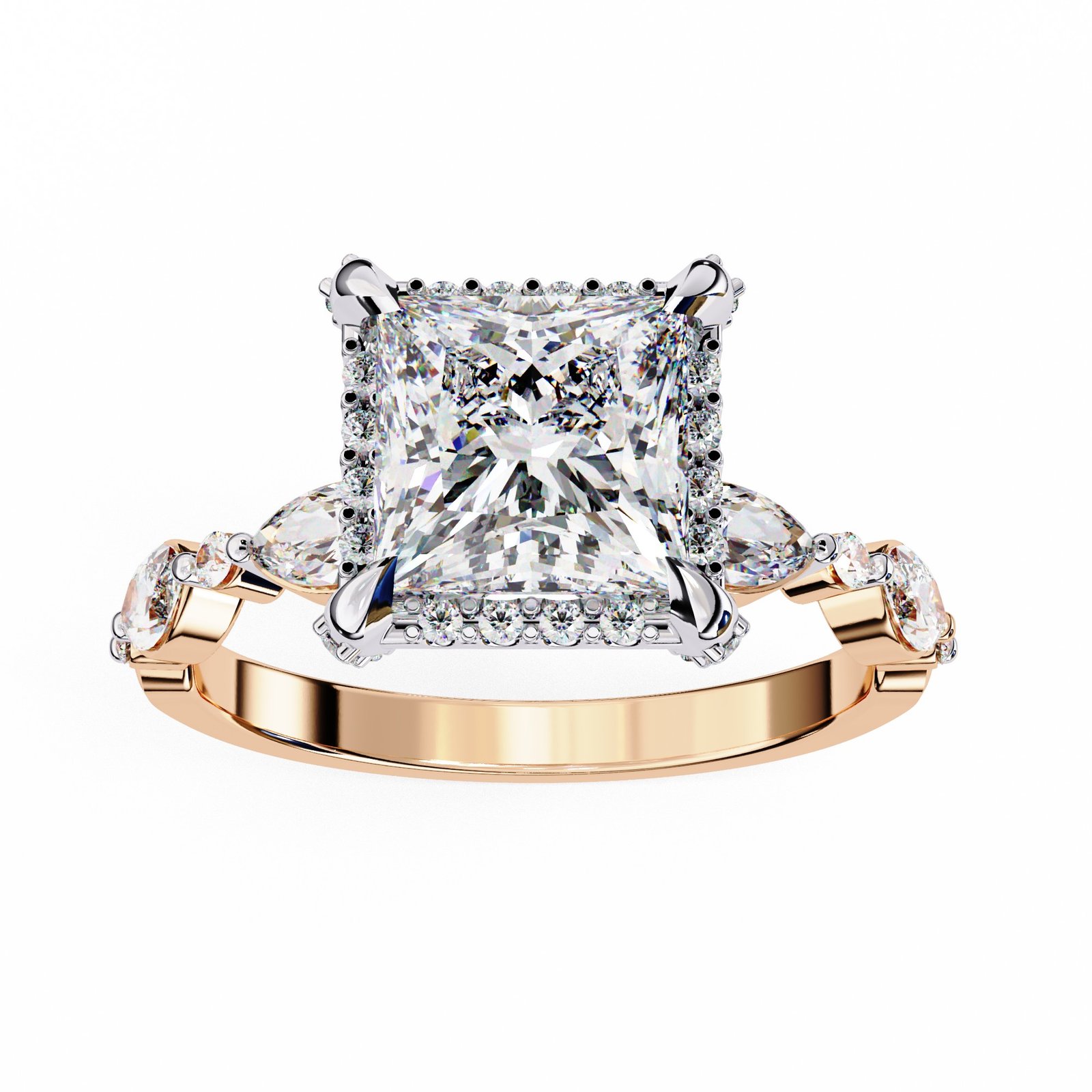 This majestic ring showcases a princess-cut diamond framed by a radiant halo, elevated by marquise and round side stones. Set in lustrous yellow gold, its regal design blends classic charm with modern elegance. Perfect for the one who deserves a ring as extraordinary as their love story.