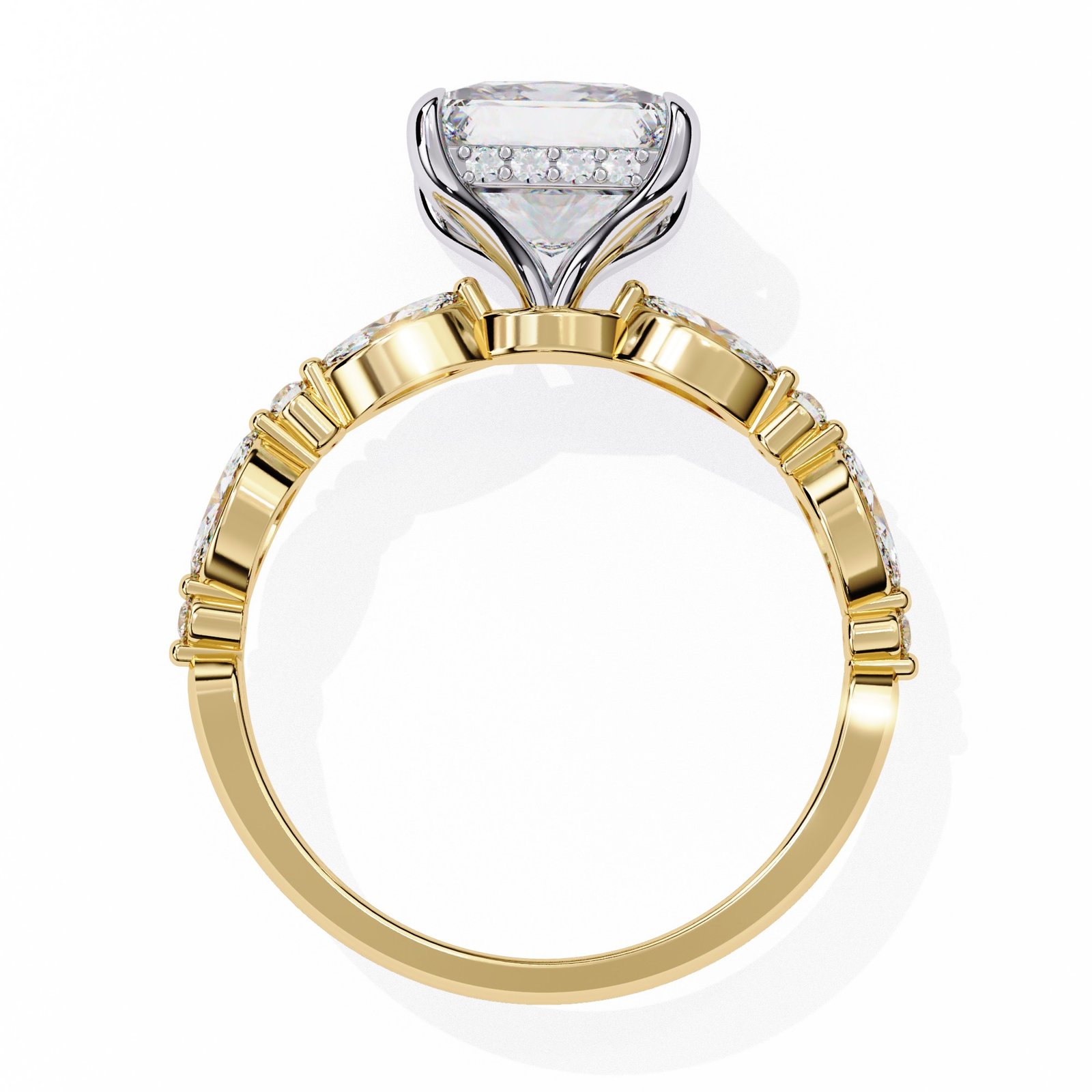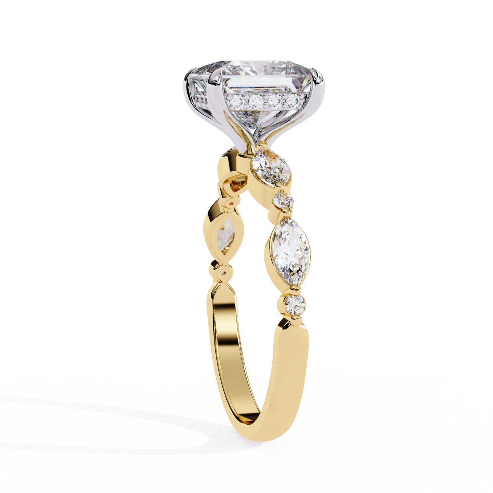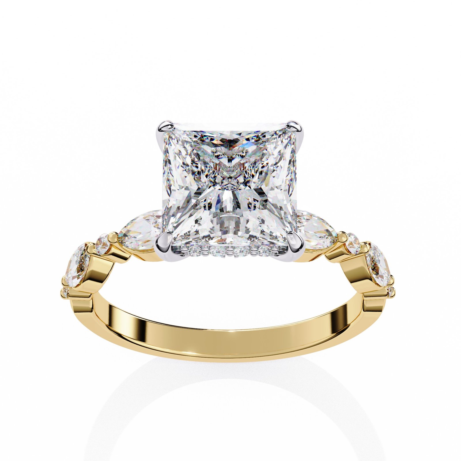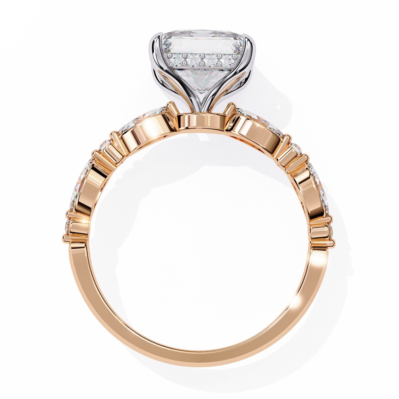 This ring features a radiant princess-cut center diamond flanked by sparkling marquise and round accent stones. Set in warm rose gold, it blends modern sophistication with vintage charm. A captivating choice for the bride who desires a timeless yet unique engagement ring that speaks of love and individuality.