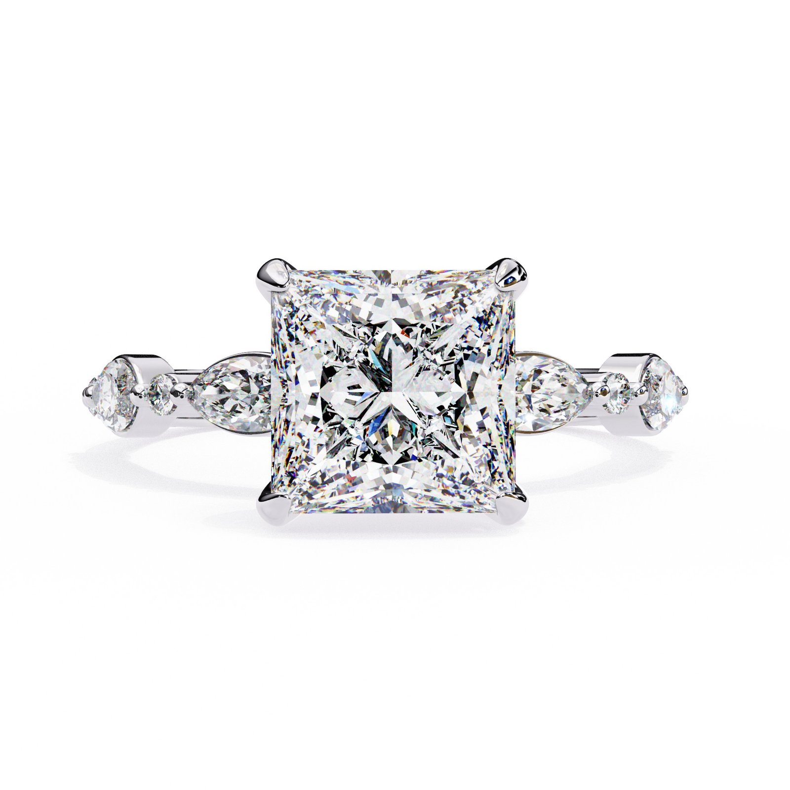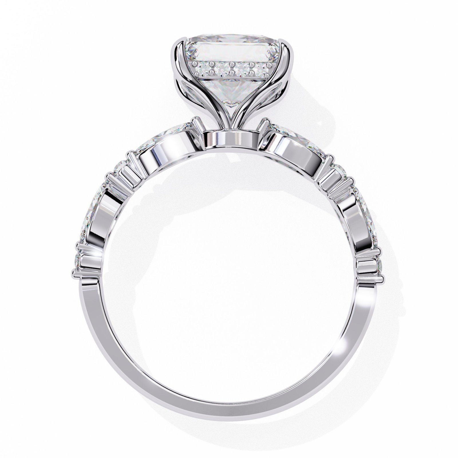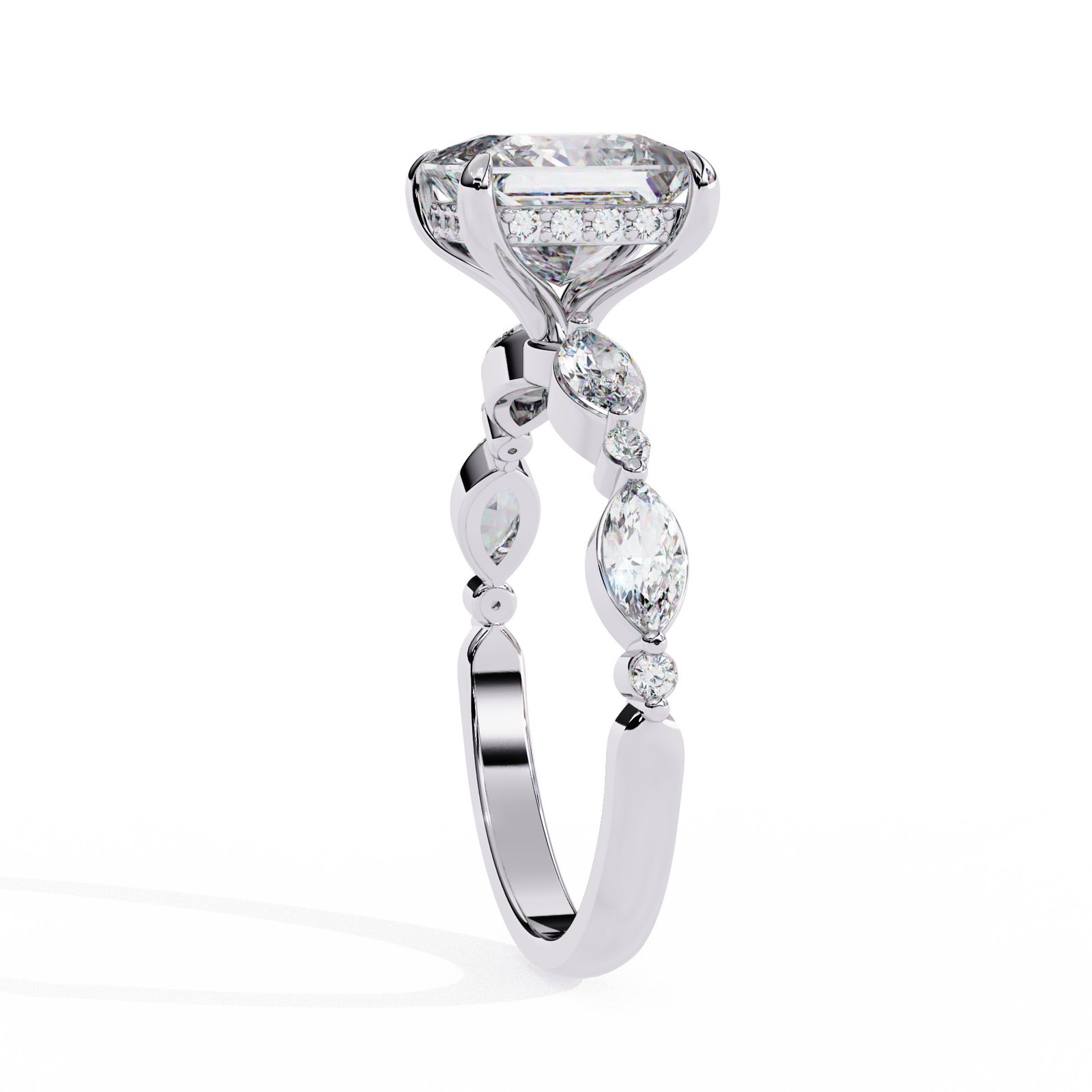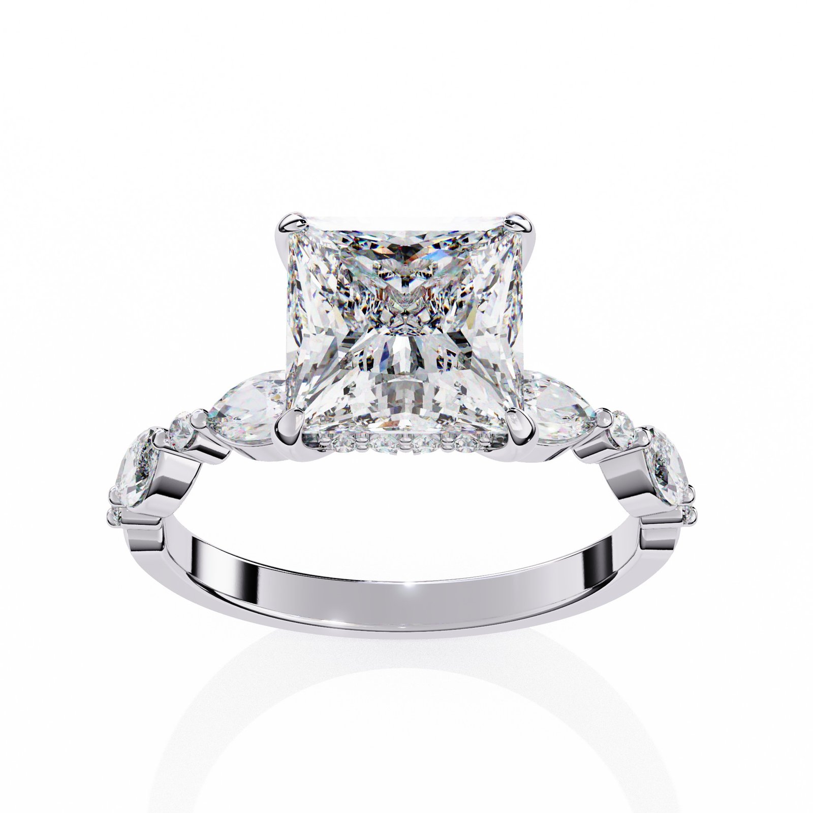 This ring features a radiant princess-cut center diamond flanked by sparkling marquise and round accent stones. Set in warm rose gold, it blends modern sophistication with vintage charm. A captivating choice for the bride who desires a timeless yet unique engagement ring that speaks of love and individuality.