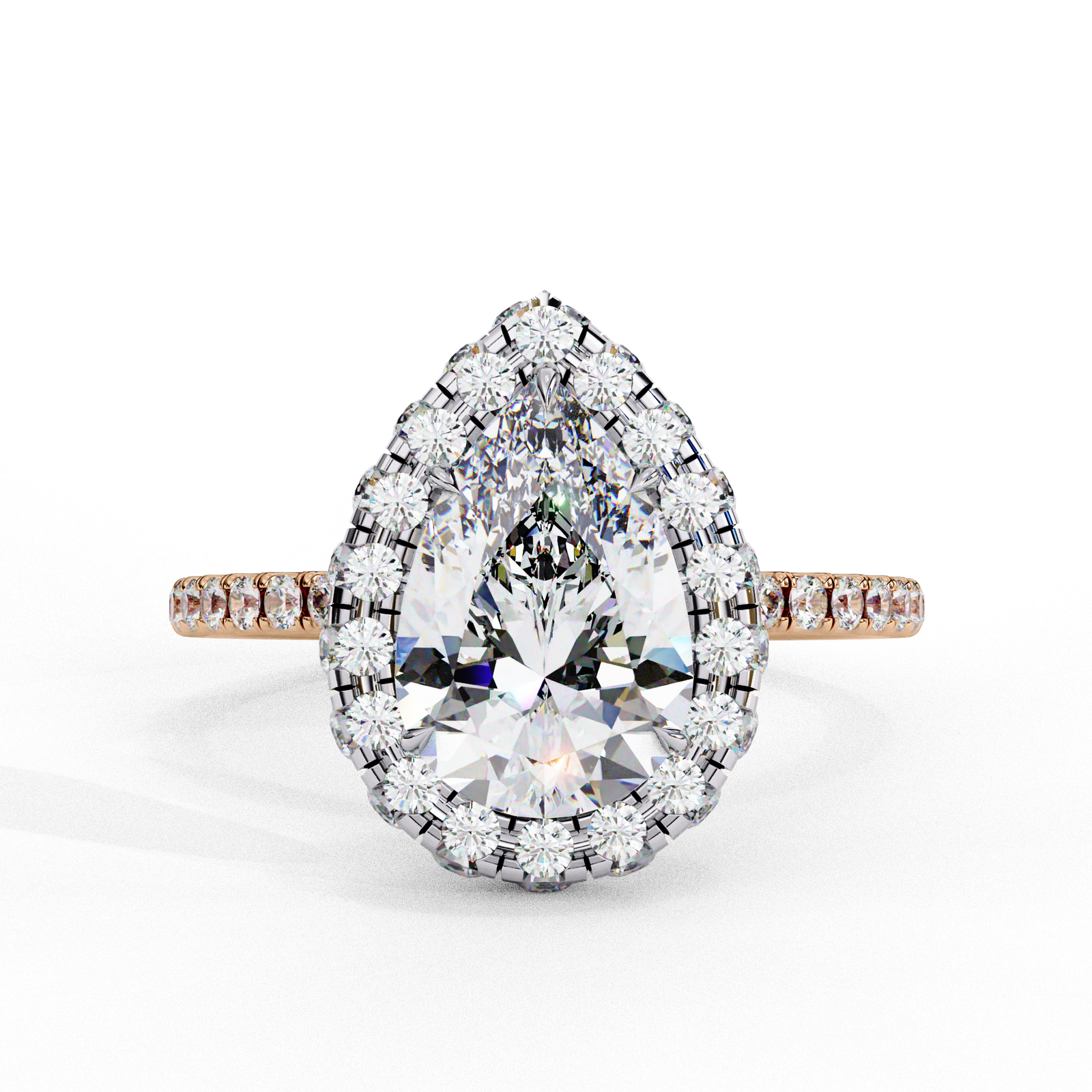 A radiant masterpiece, this ring features a breathtaking pear-shaped diamond embraced by a halo of scintillating round diamonds. The brilliance cascades onto a gleaming gold pavé band, creating a stunning contrast. Bold yet romantic, this design captures elegance, fire, and individuality—perfect for a love story that's anything but ordinary.