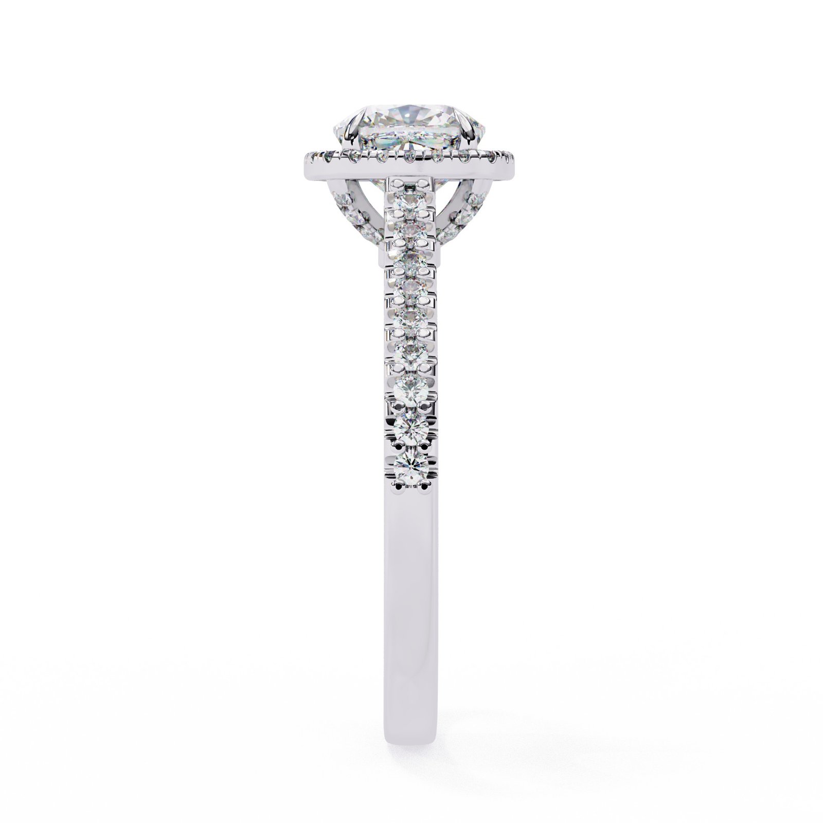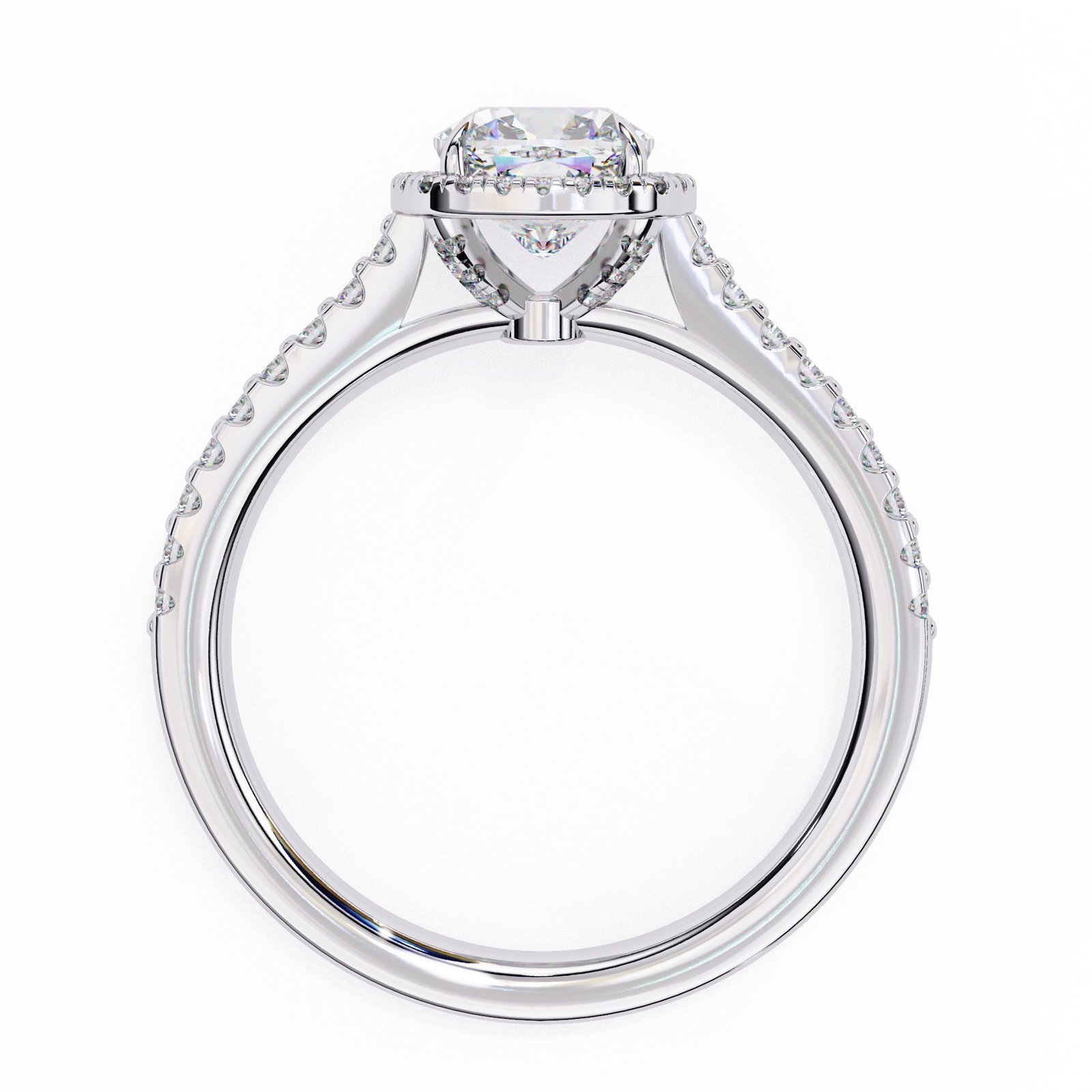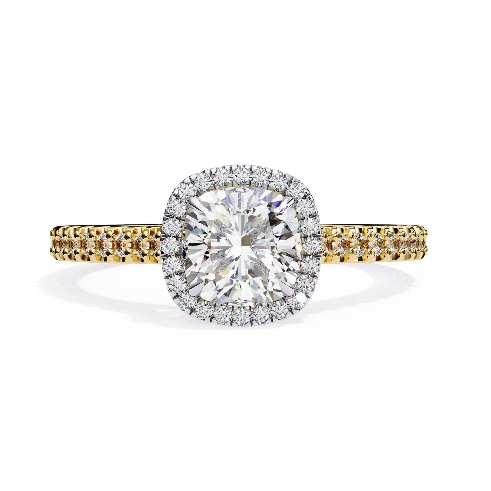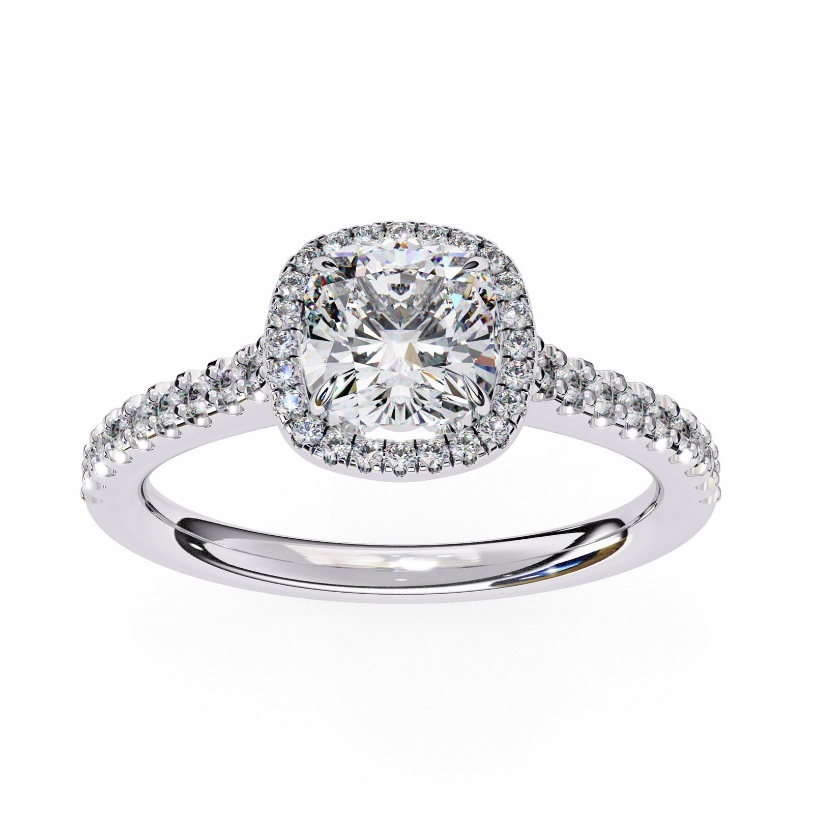 This stunning engagement ring features a brilliant cushion-cut diamond surrounded by a halo of smaller diamonds, enhancing its sparkle. The pave diamond band adds extra shimmer, creating a timeless and elegant piece perfect for celebrating love and commitment. Crafted in white gold for a modern, sophisticated look.