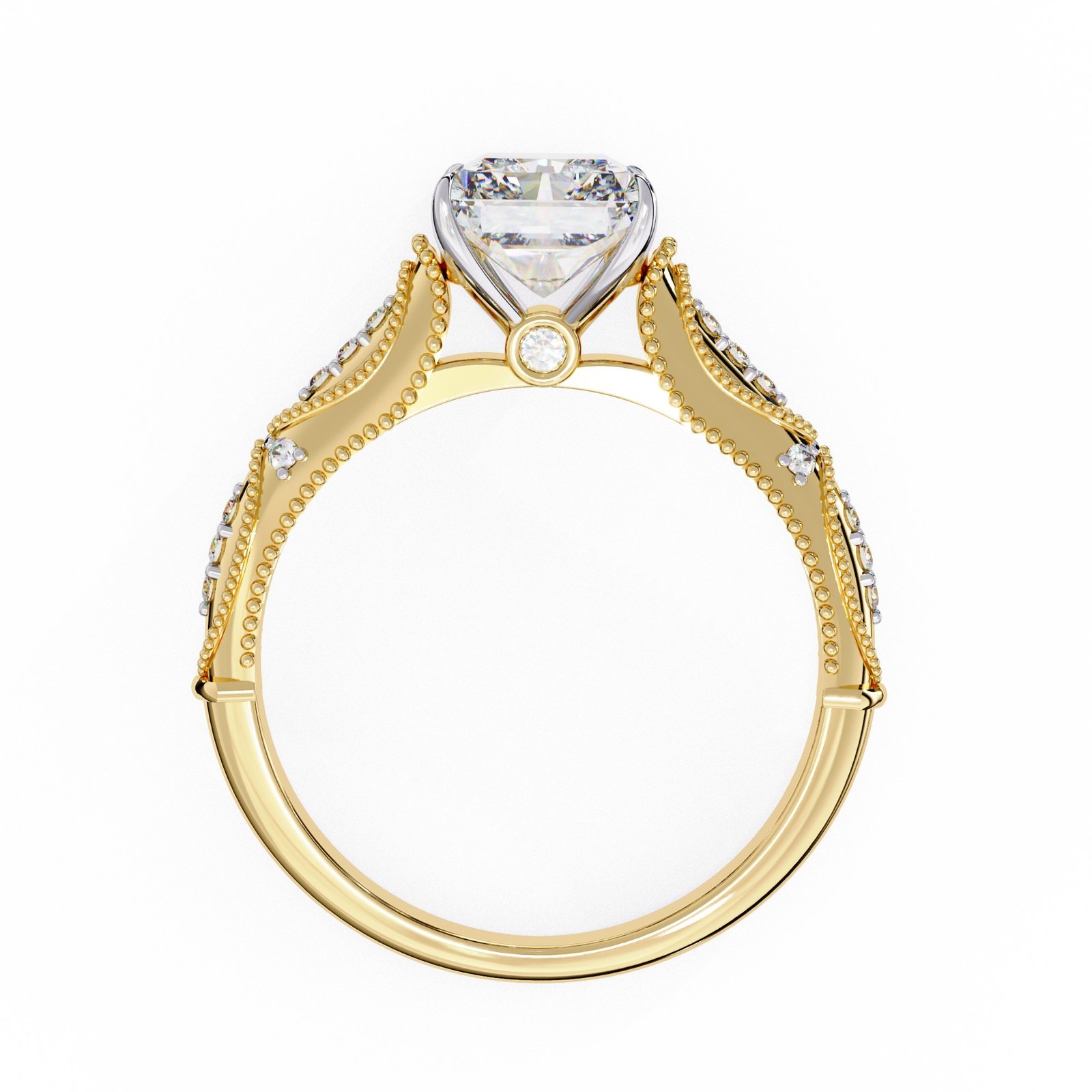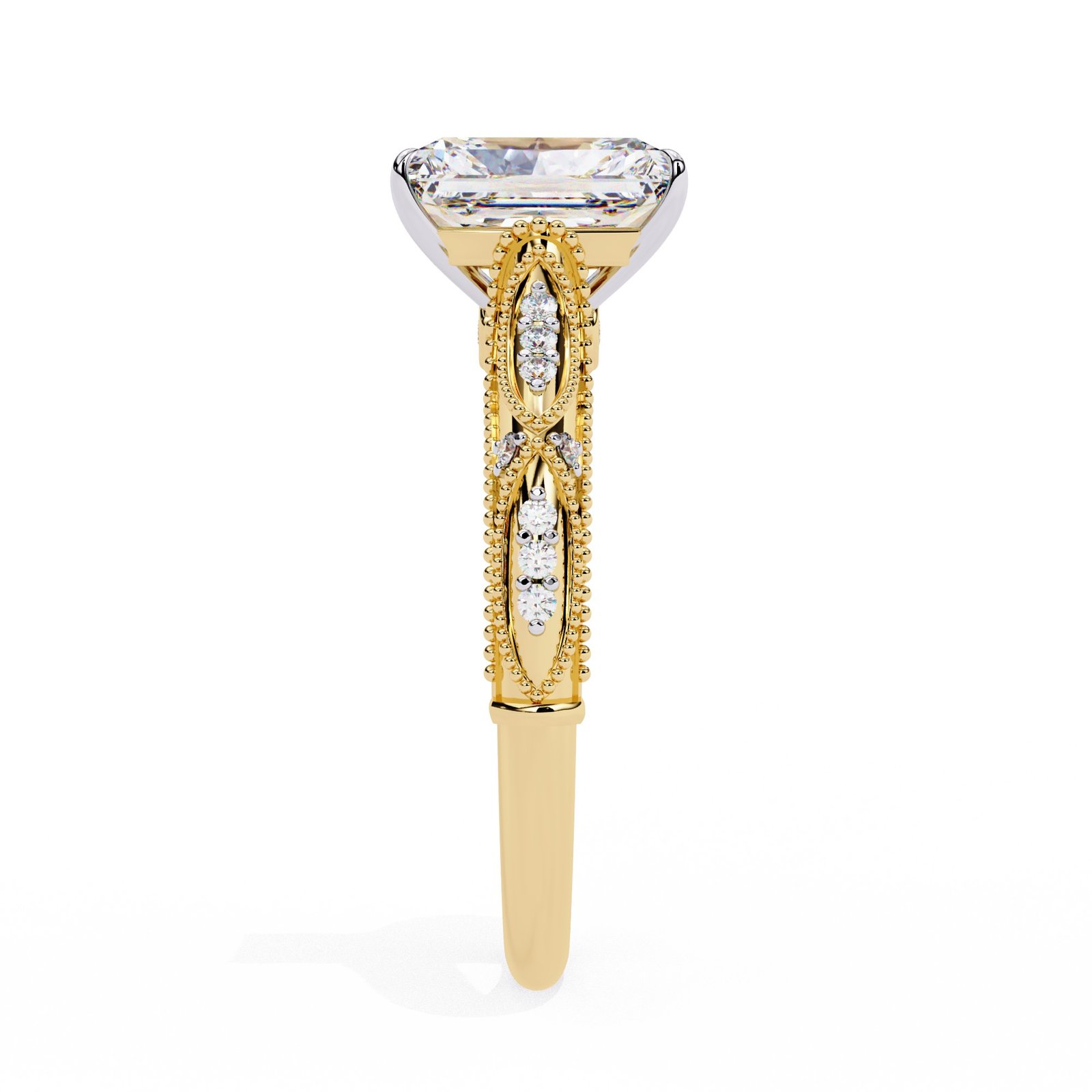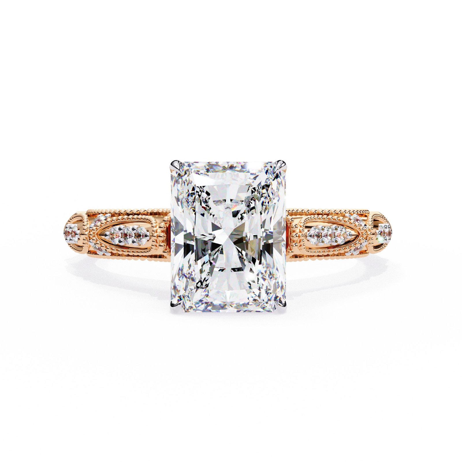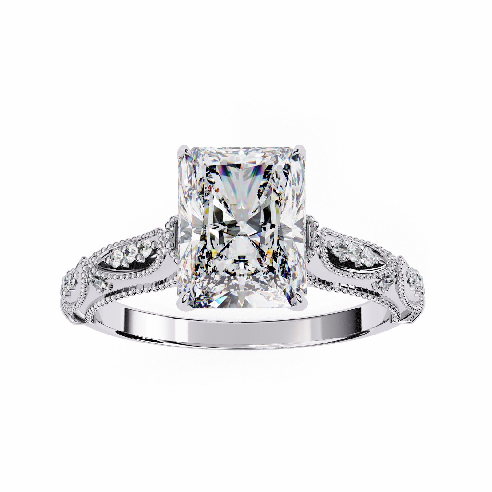 This exquisite radiant cut diamond engagement ring features intricate milgrain and filigree detailing along the band, adding vintage charm and elegance. The dazzling center stone is perfectly showcased by the delicate design, making it a timeless piece symbolizing beauty, sophistication, and everlasting love.