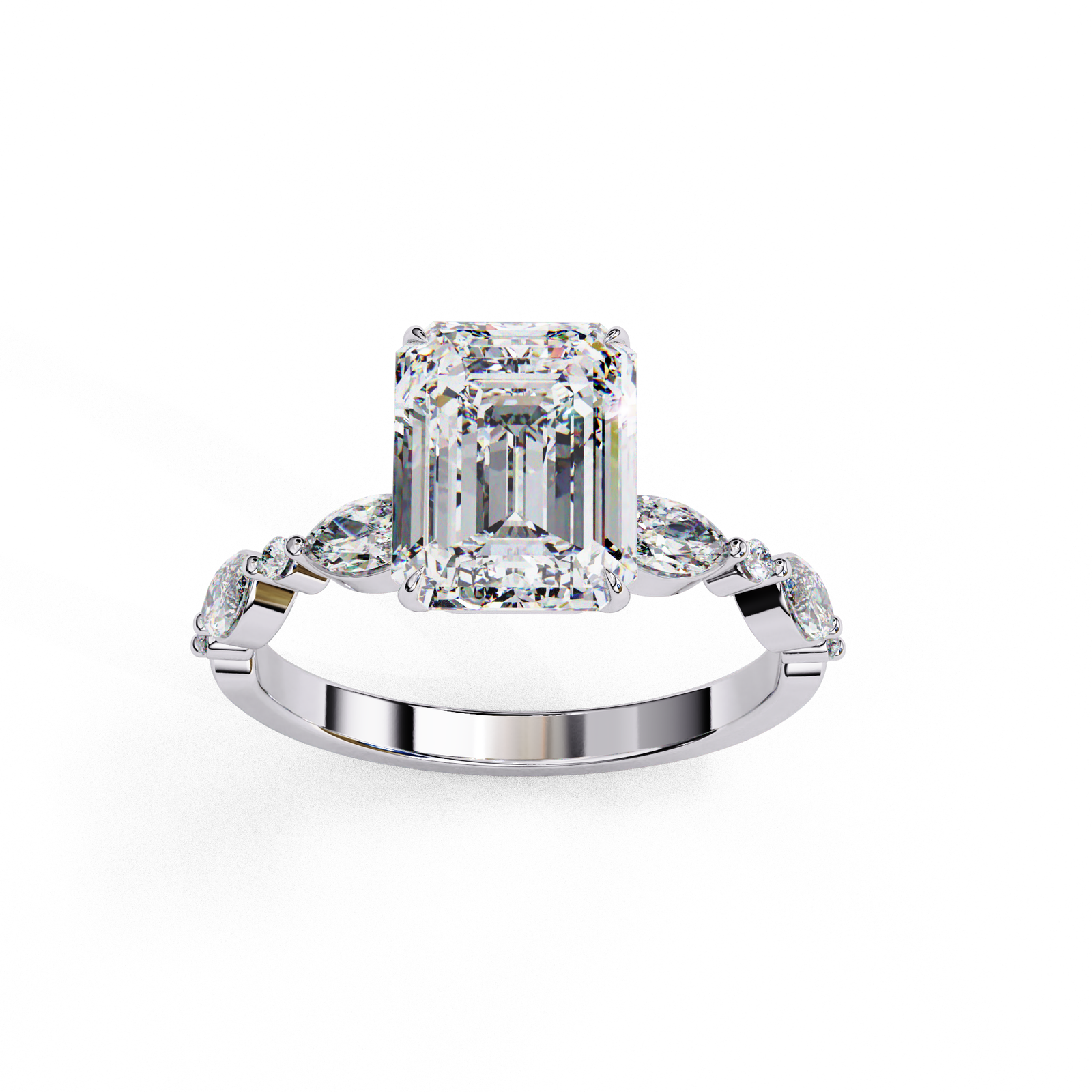 Bold and breathtaking, this emerald-cut diamond ring features a striking center stone flanked by marquise and round diamonds, creating a perfect harmony of shape and sparkle. Set in luminous gold, its clean lines and vintage-inspired elegance make it an unforgettable choice for the modern romantic with timeless taste.