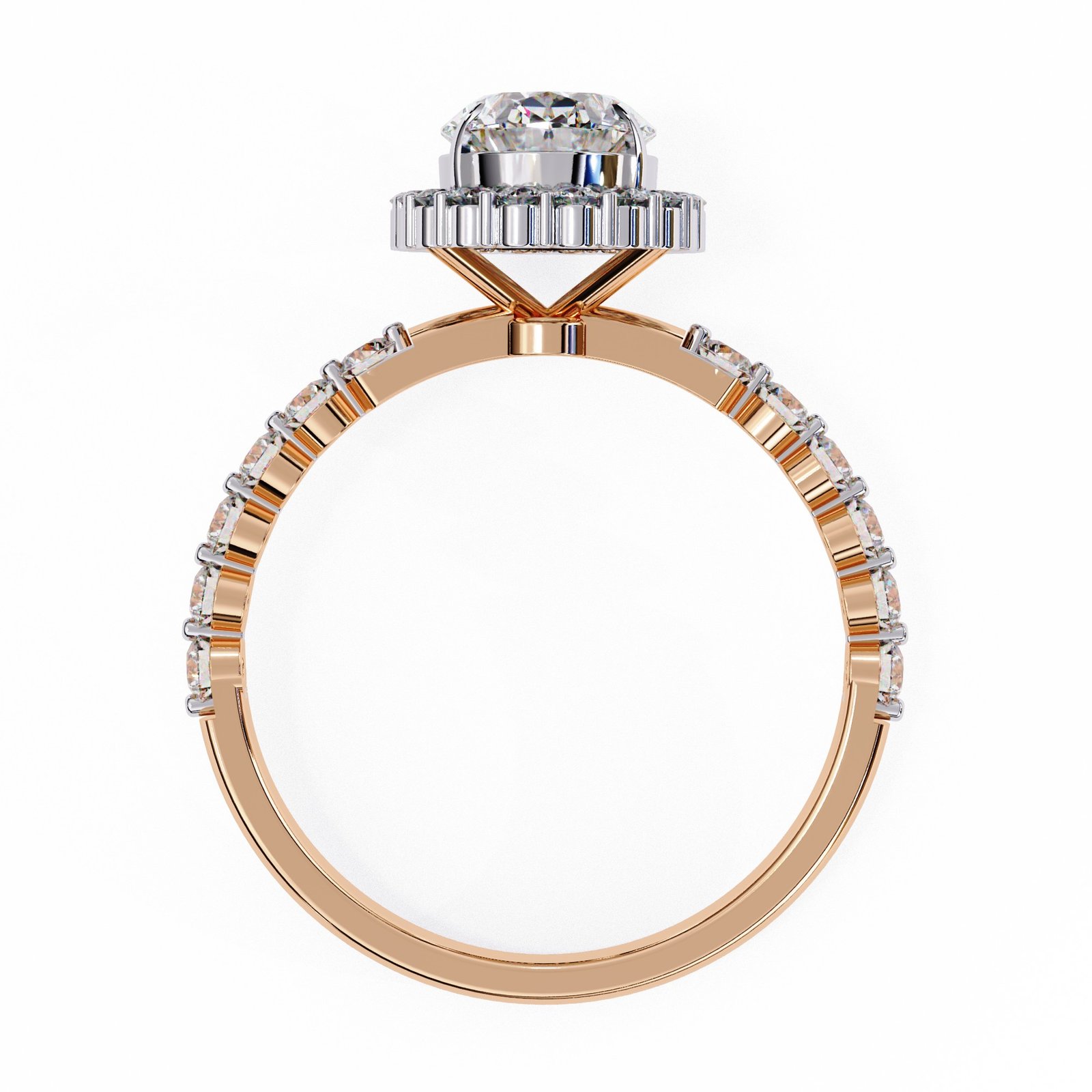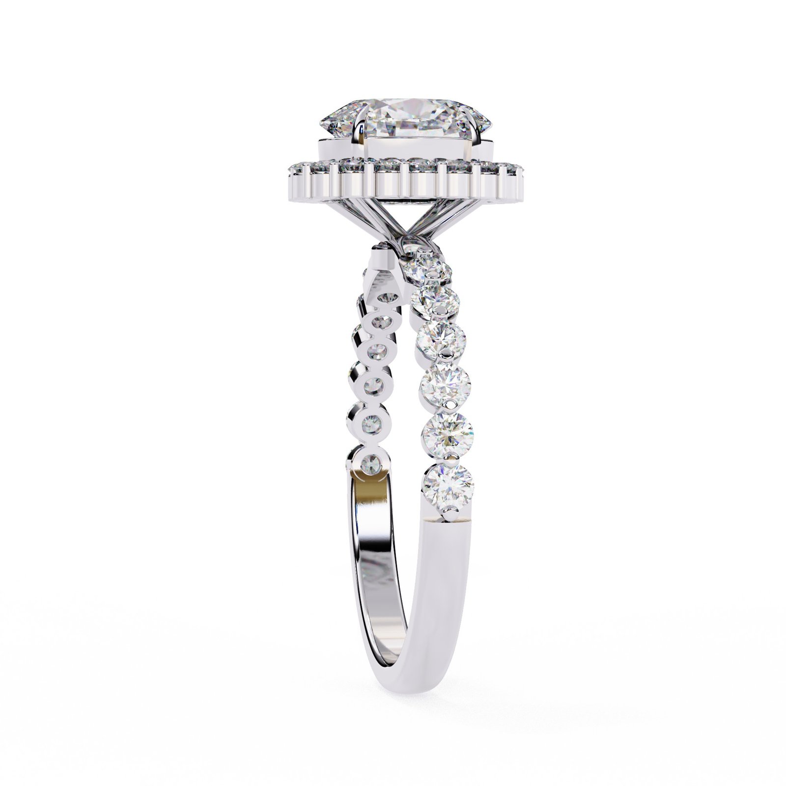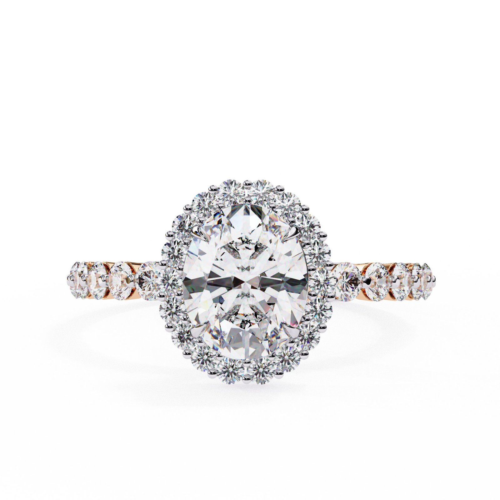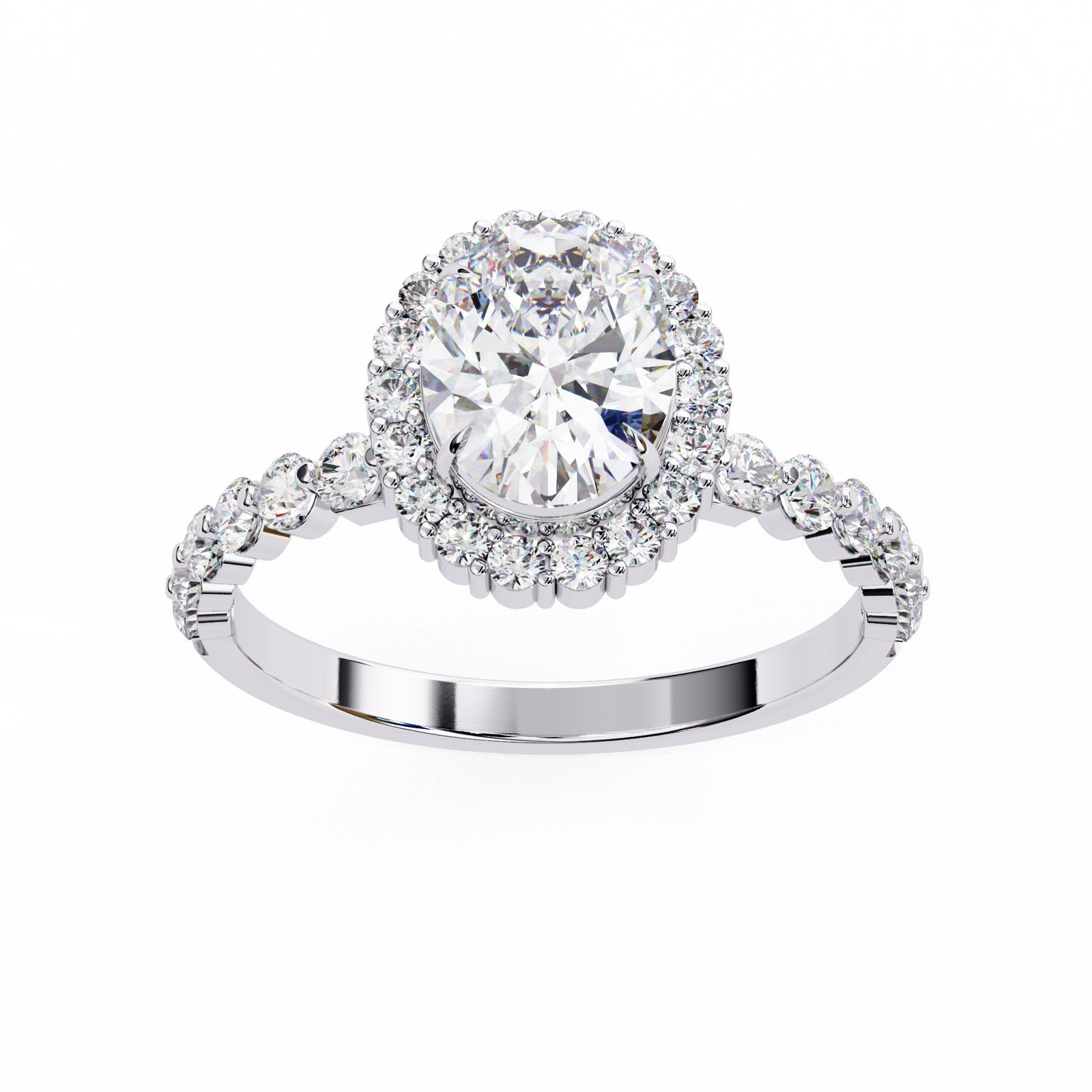 A breathtaking oval-cut diamond takes center stage in this elegant halo ring, framed by a circle of shimmering accent stones. Set in sleek white gold, the band features pavé-set diamonds for extra brilliance. A timeless design that radiates sophistication and charm, perfect for a romantic and enduring engagement.