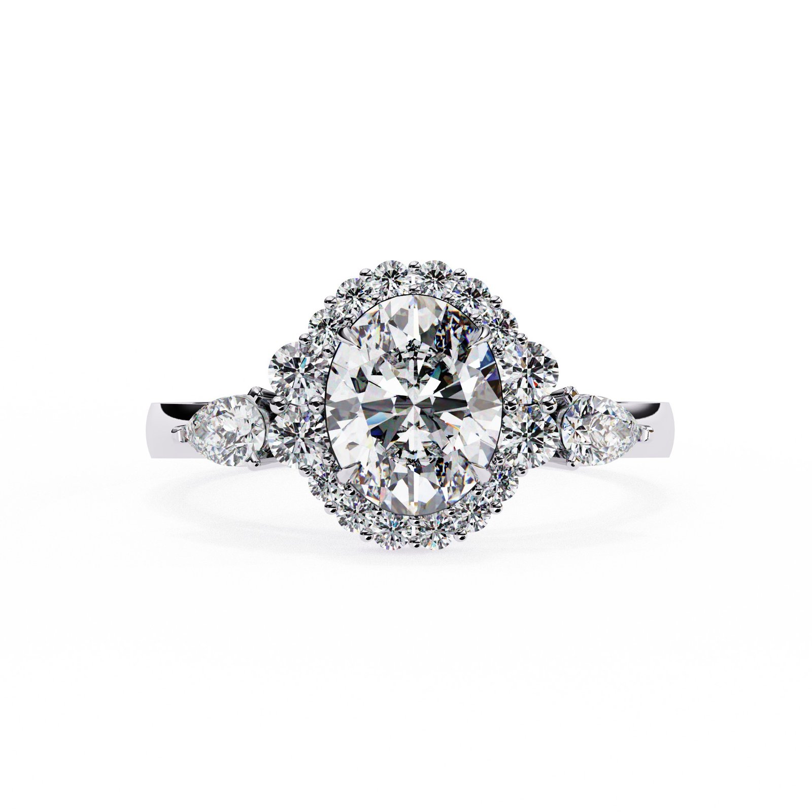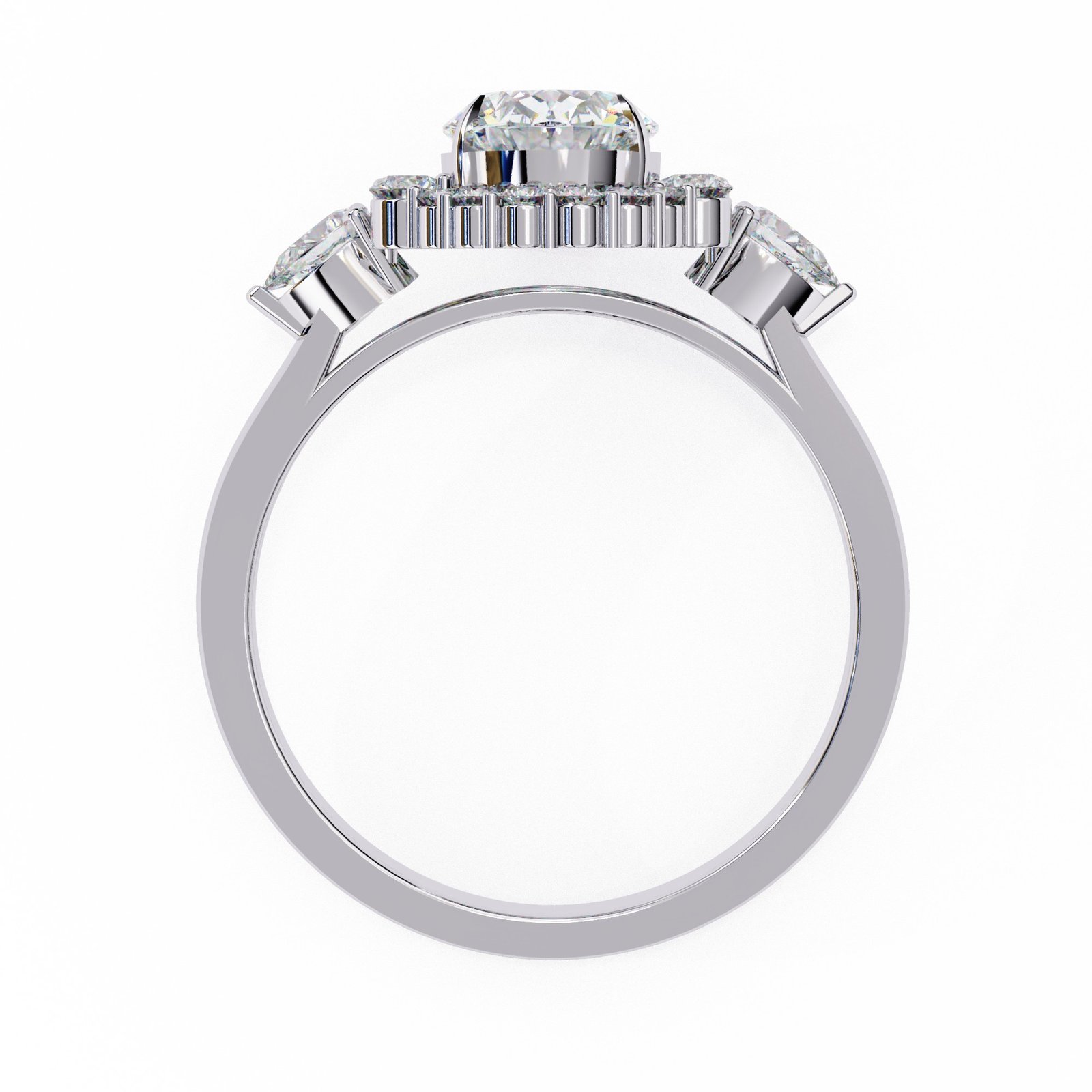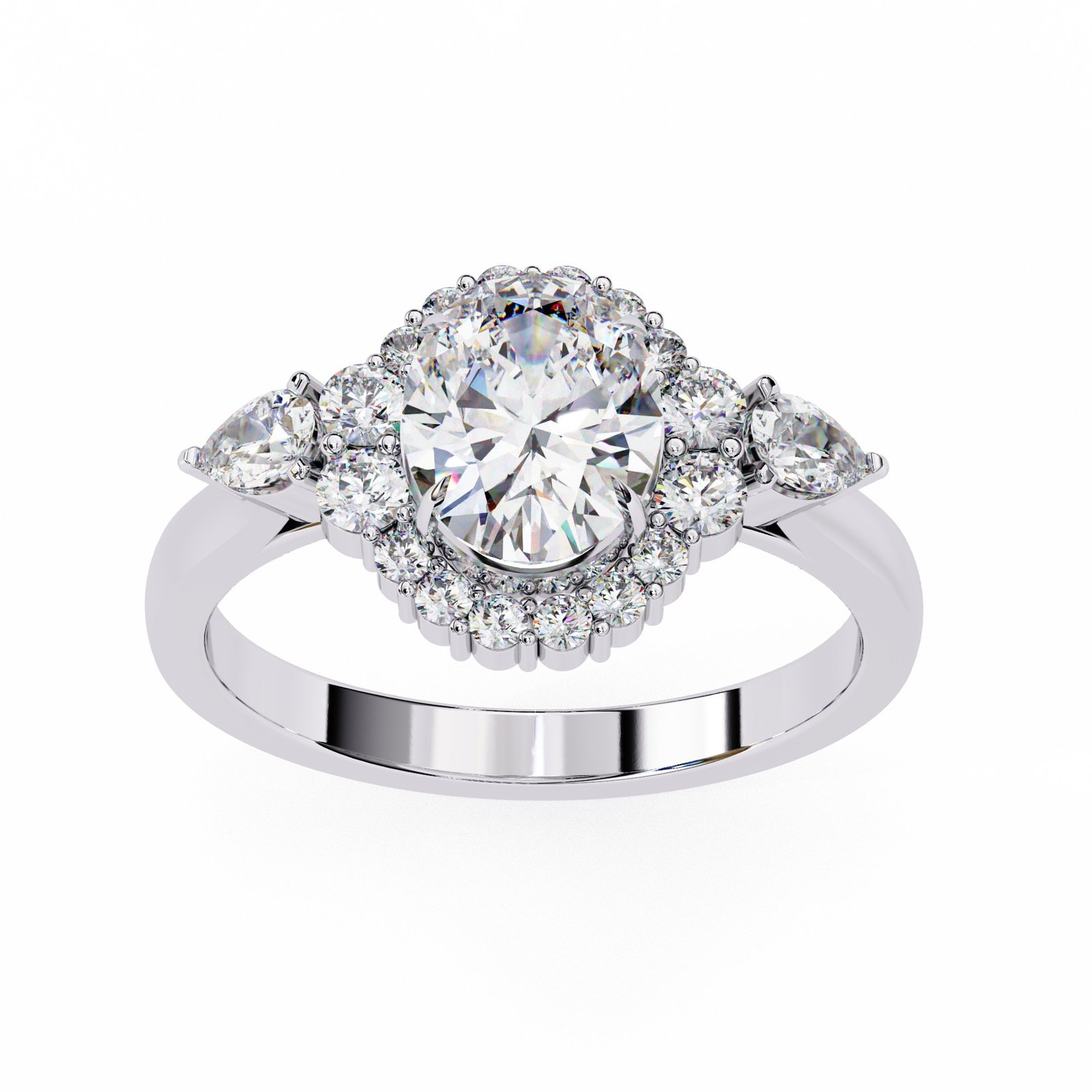 This exquisite oval-cut diamond ring features a dazzling halo of brilliant round diamonds, enhancing its radiant center. Flanked by pear-shaped side stones, the design exudes timeless elegance and sophistication. Crafted in lustrous white gold, it’s a perfect symbol of everlasting love and refined luxury, ideal for any special proposal.