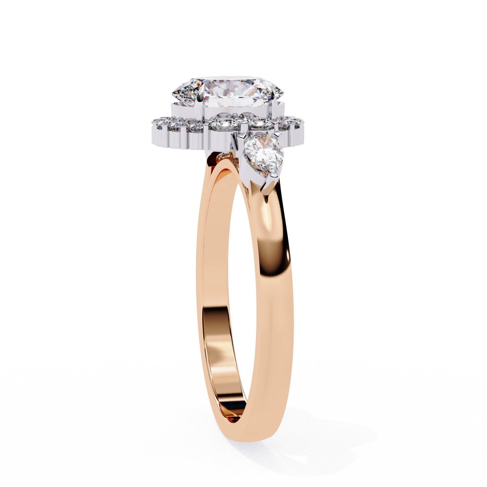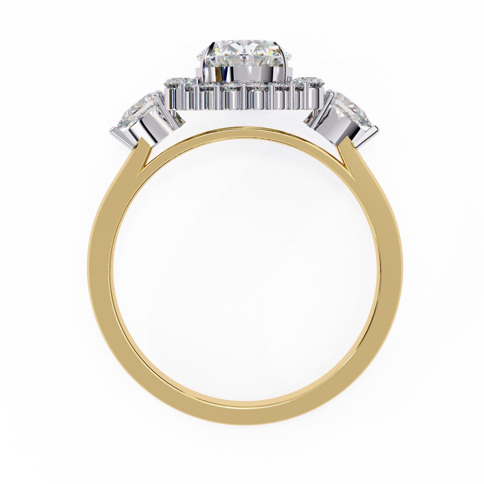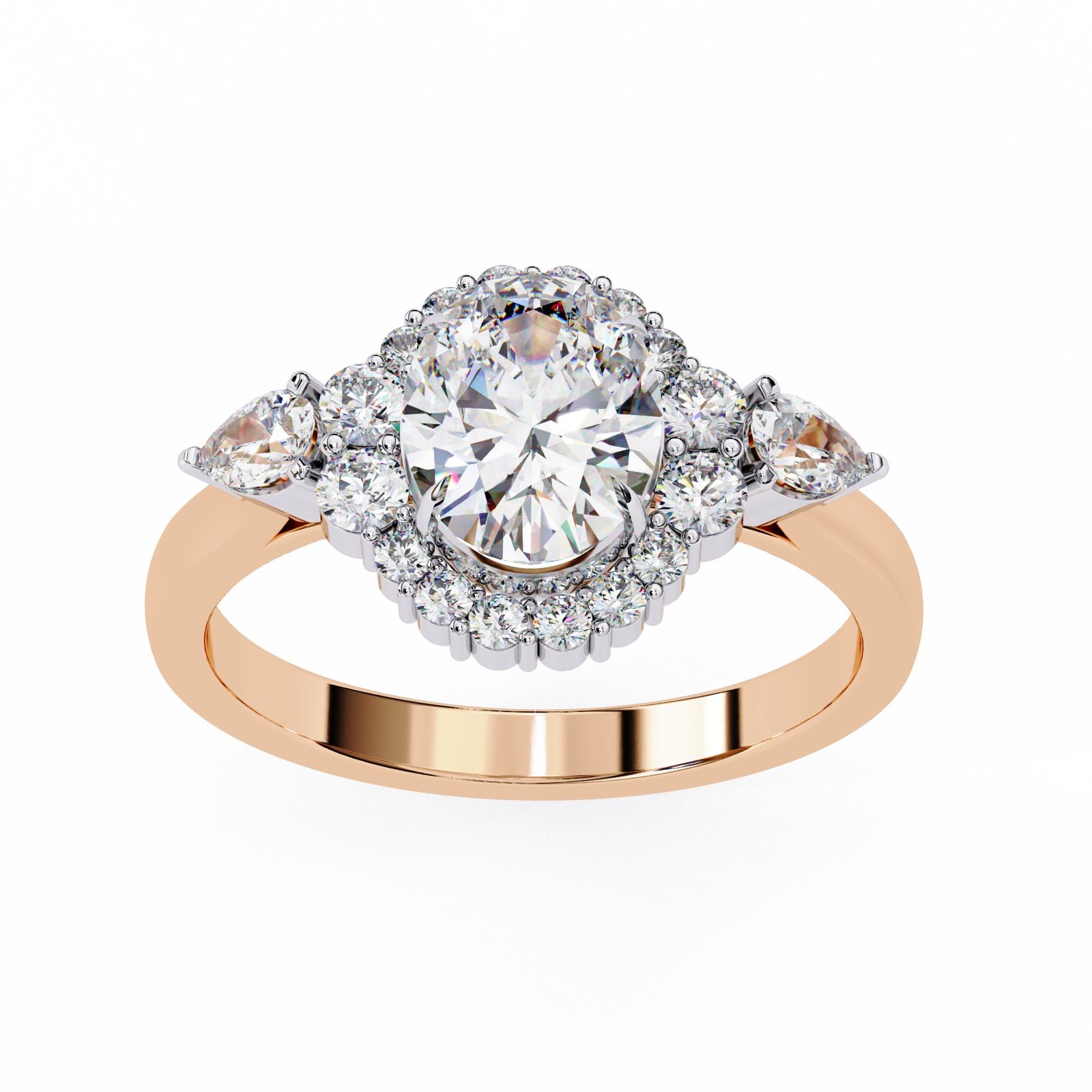 This exquisite oval-cut diamond ring features a dazzling halo of brilliant round diamonds, enhancing its radiant center. Flanked by pear-shaped side stones, the design exudes timeless elegance and sophistication. Crafted in lustrous white gold, it’s a perfect symbol of everlasting love and refined luxury, ideal for any special proposal.