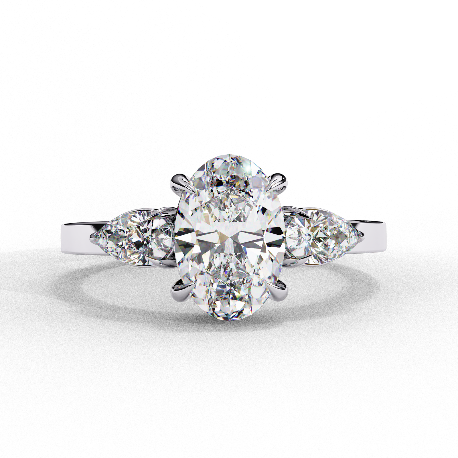 This stunning engagement ring features a brilliant oval-cut center diamond accented by pear-shaped side stones, symbolizing everlasting elegance. Set in a refined gold band, the design blends modern minimalism with timeless beauty—ideal for those who seek a sophisticated, eye-catching ring that tells a story of love and commitment.