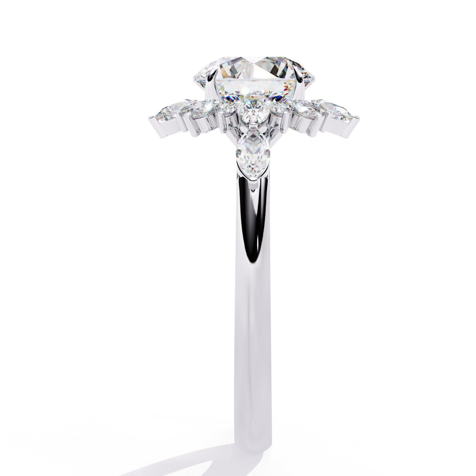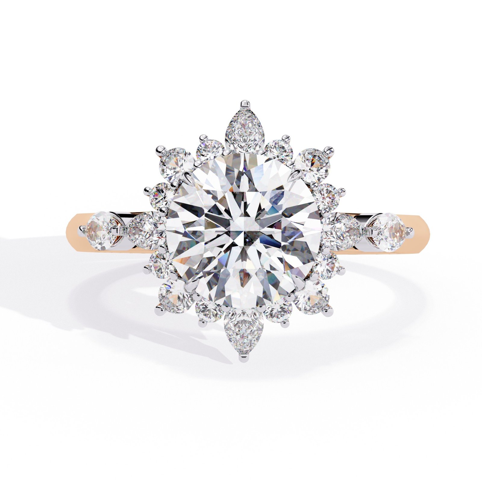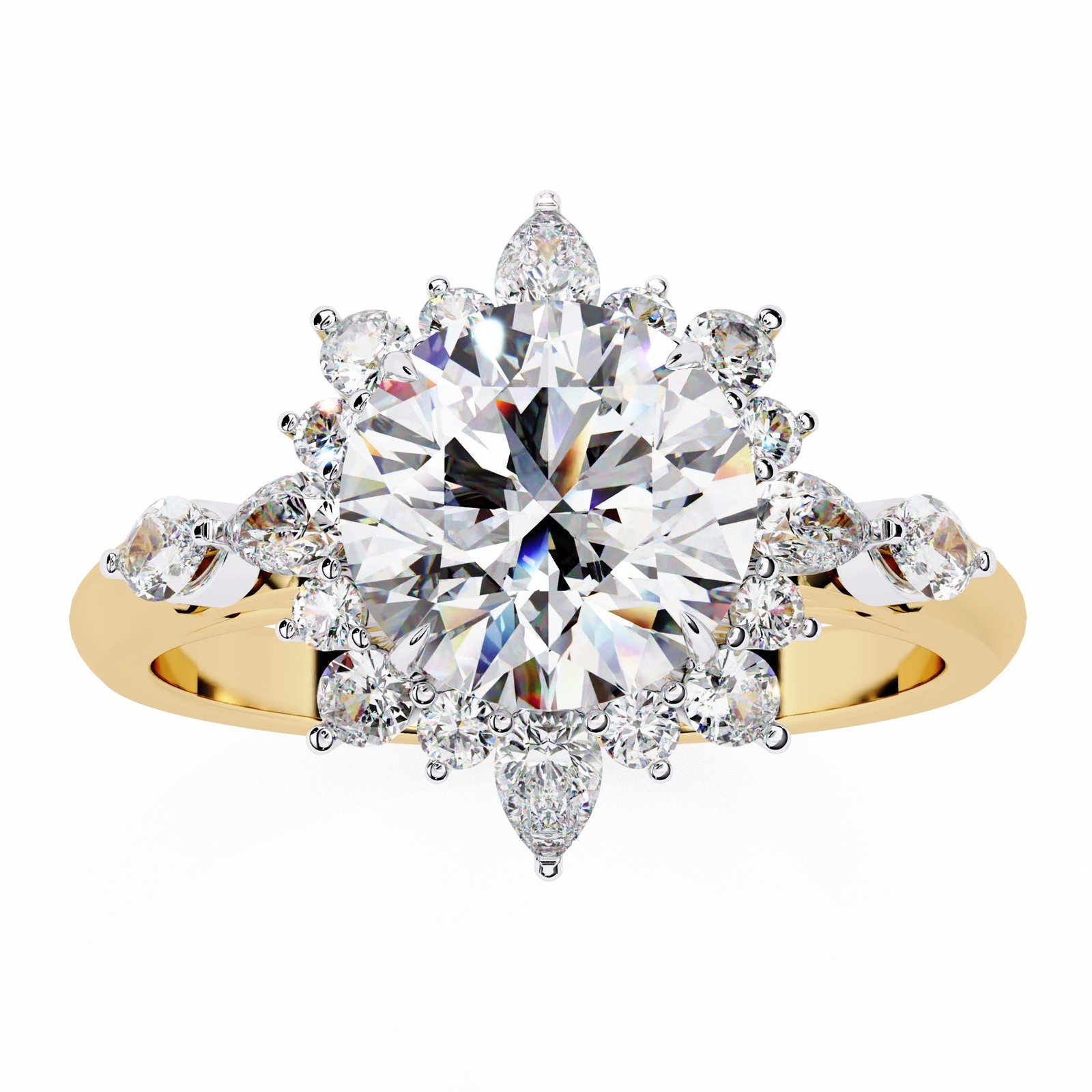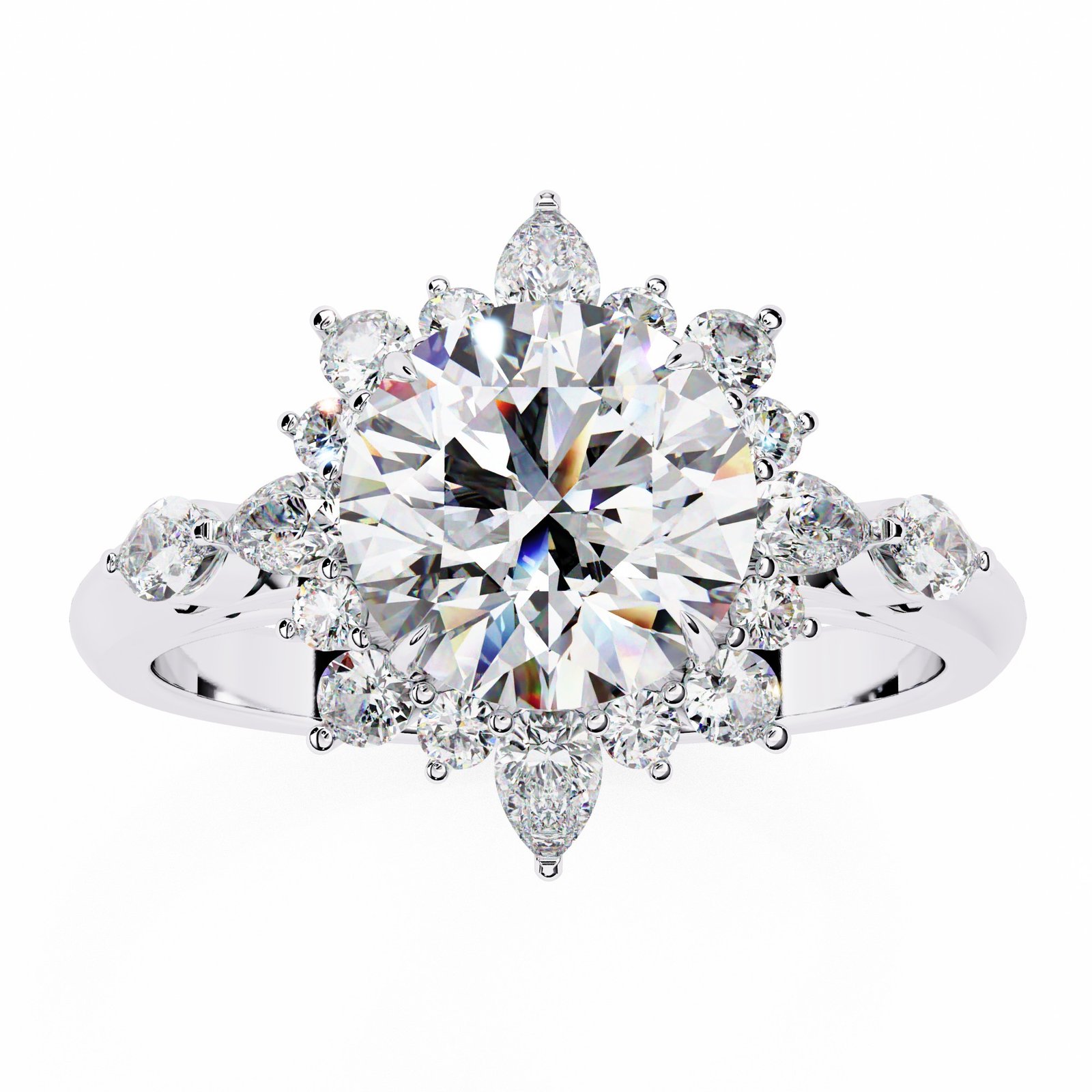 This dazzling engagement ring features a brilliant round center diamond encircled by a halo of pear and round diamonds in a radiant sunburst design. Set in sleek white gold, it captures the essence of elegance and light, making it a breathtaking symbol of love that shines from every angle.