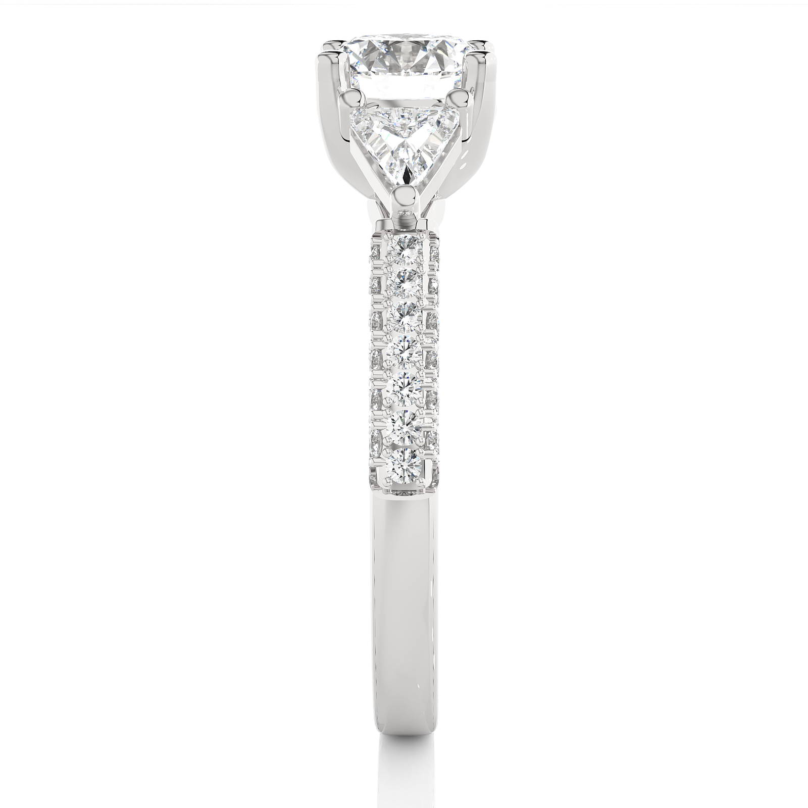 This stunning engagement ring showcases a brilliant round center diamond flanked by two triangular side stones, set on a luxurious yellow gold band adorned with sparkling pave diamonds. Its sophisticated design combines classic beauty and modern glamour, perfect for symbolizing eternal love and commitment with dazzling brilliance.