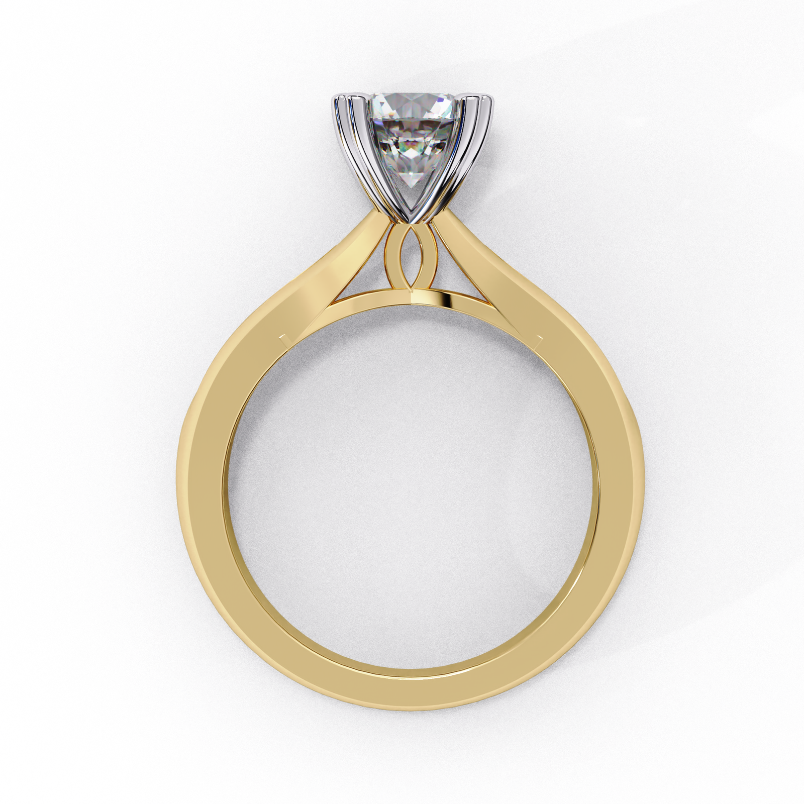 Crafted to captivate, this striking engagement ring features a brilliant round diamond secured by six gold prongs, perfectly contrasted against a polished gold band. The split shank design adds a touch of elegance, making it an ideal choice for those who appreciate timeless beauty with a bold, graceful flair.
