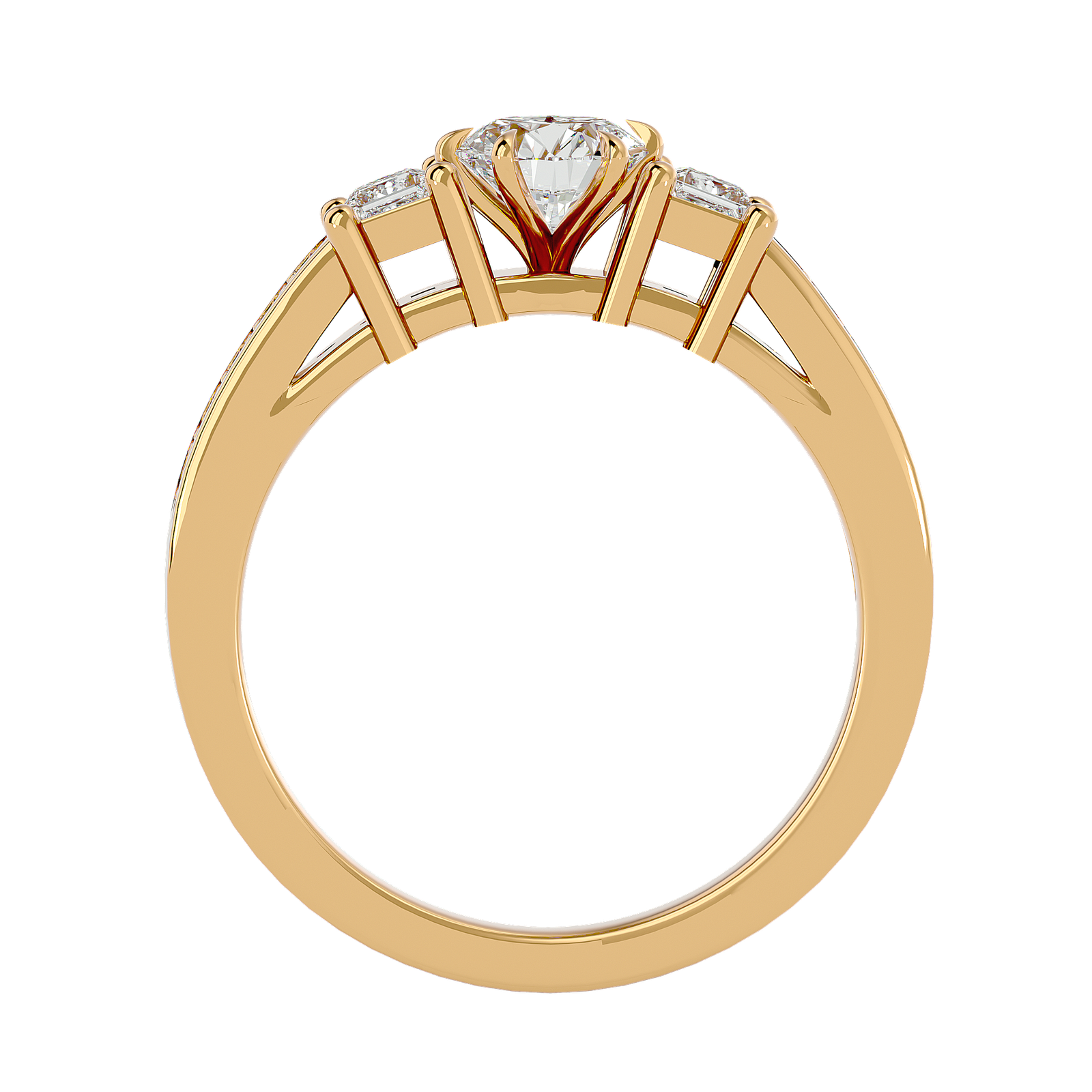 This exquisite engagement ring features a dazzling round center diamond flanked by two princess-cut diamonds. The elegant yellow gold band is adorned with sparkling prong-set diamonds, enhancing its timeless beauty. Perfect for celebrating love, this ring combines classic sophistication with brilliant sparkle for an unforgettable statement.
