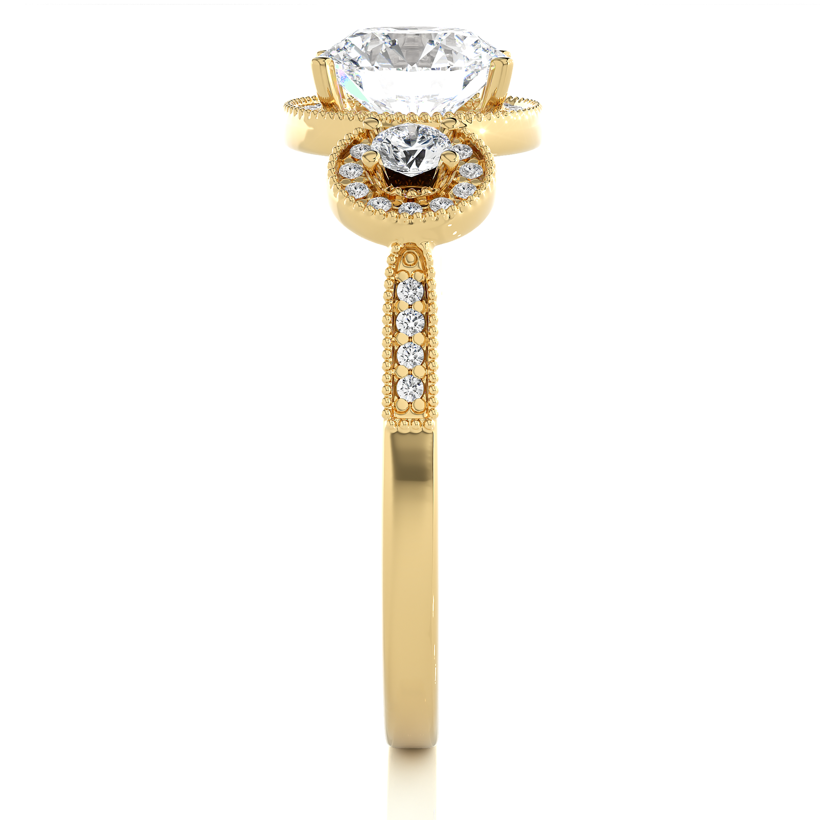This exquisite vintage-inspired three-stone ring. A dazzling round center diamond is framed by a delicate halo of accent stones, flanked by two equally stunning side diamonds. Set in warm yellow gold with intricate milgrain detailing, this design radiates timeless elegance and sophisticated sparkle from every angle.
