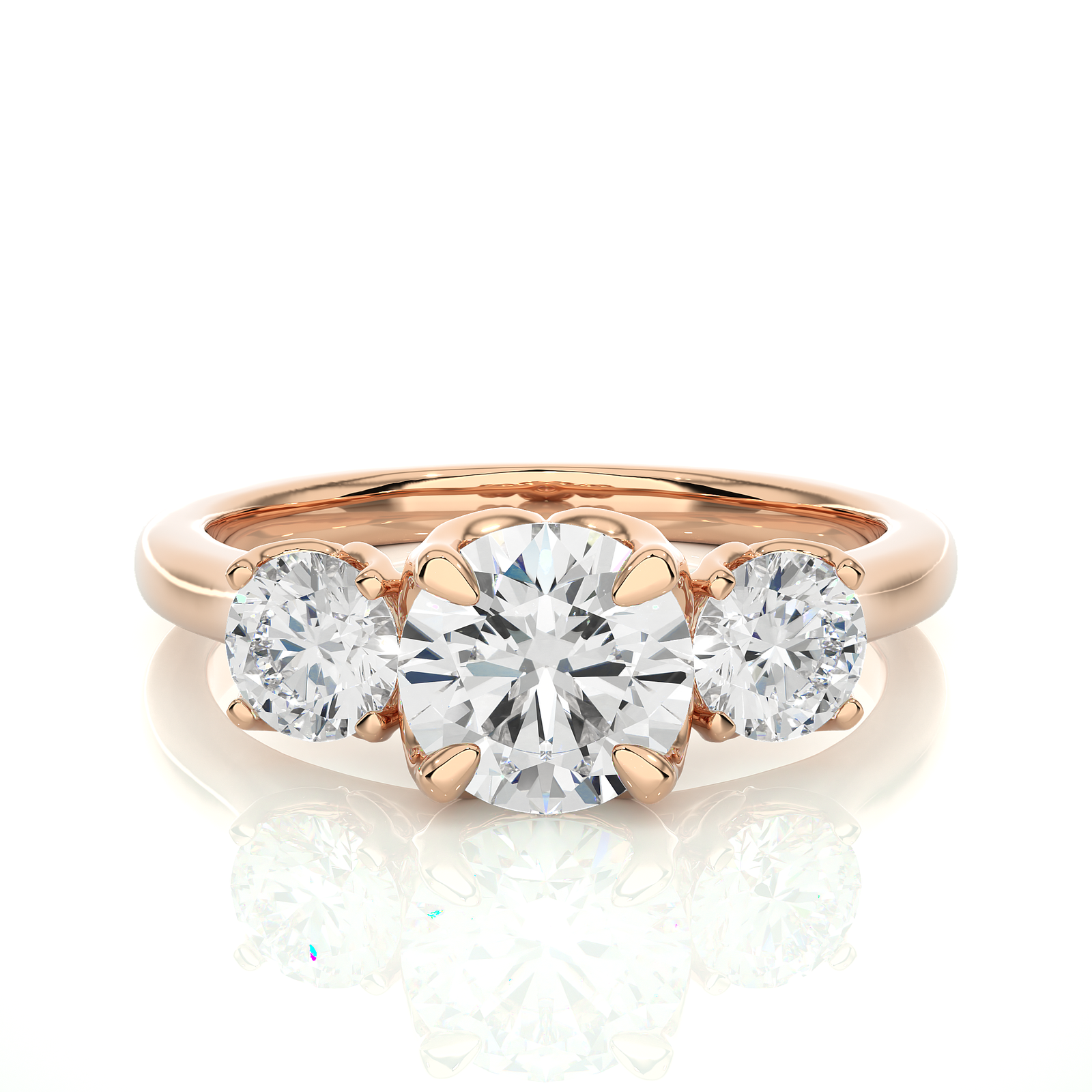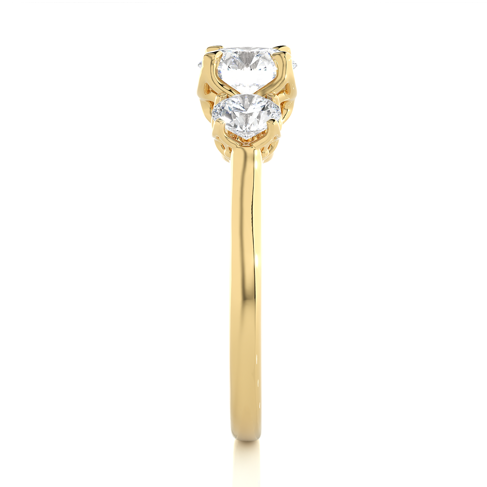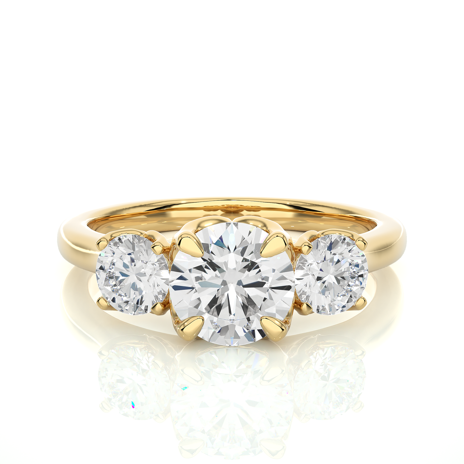 This elegant three-stone diamond ring. Featuring a brilliant round center stone flanked by two sparkling round side diamonds, all set in rich yellow gold, this ring symbolizes your past, present, and future. A sophisticated design that radiates brilliance and enduring charm for every occasion.
