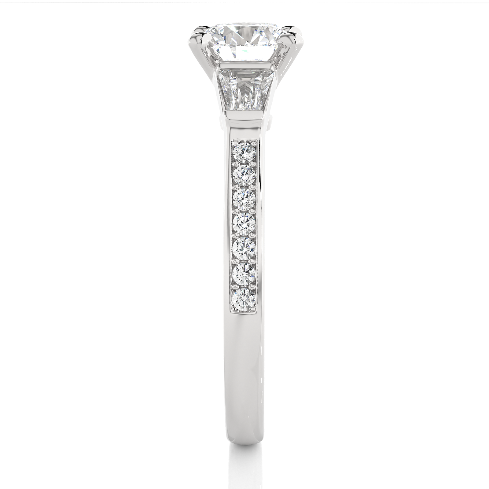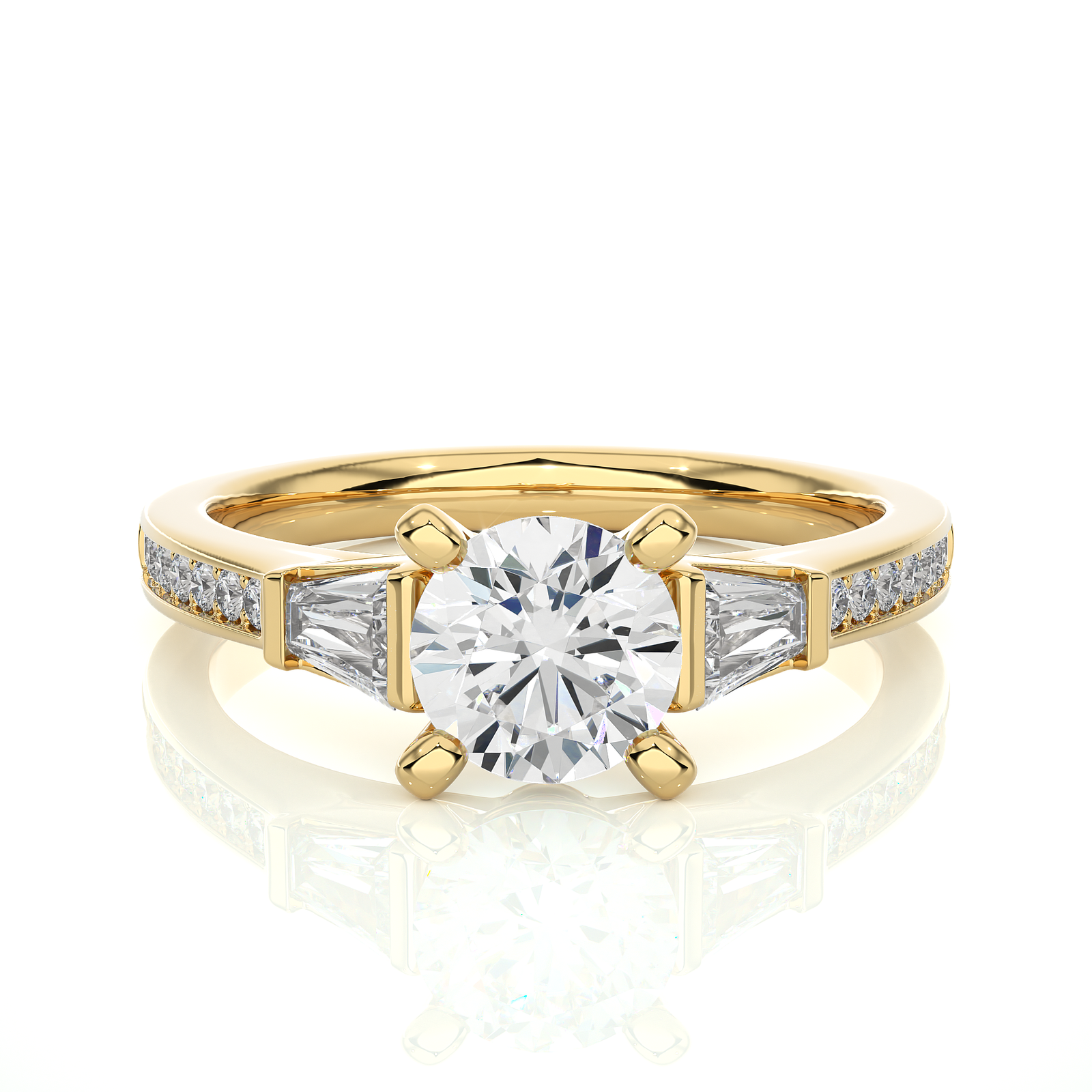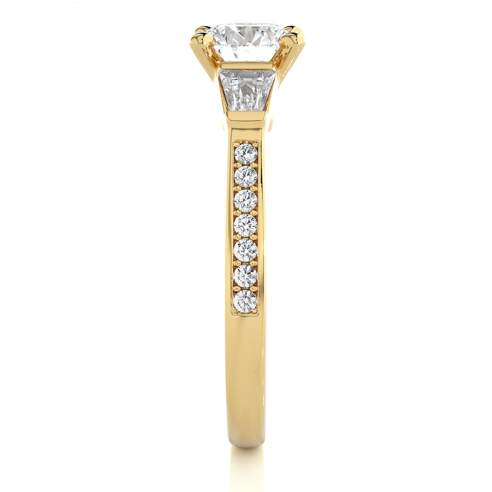 This gold engagement ring features a dazzling round-cut center diamond, flanked by tapered baguette accents. The pave-set diamonds along the band add a touch of sparkle and sophistication. A perfect blend of vintage charm and contemporary style—crafted to symbolize a love that shines endlessly.