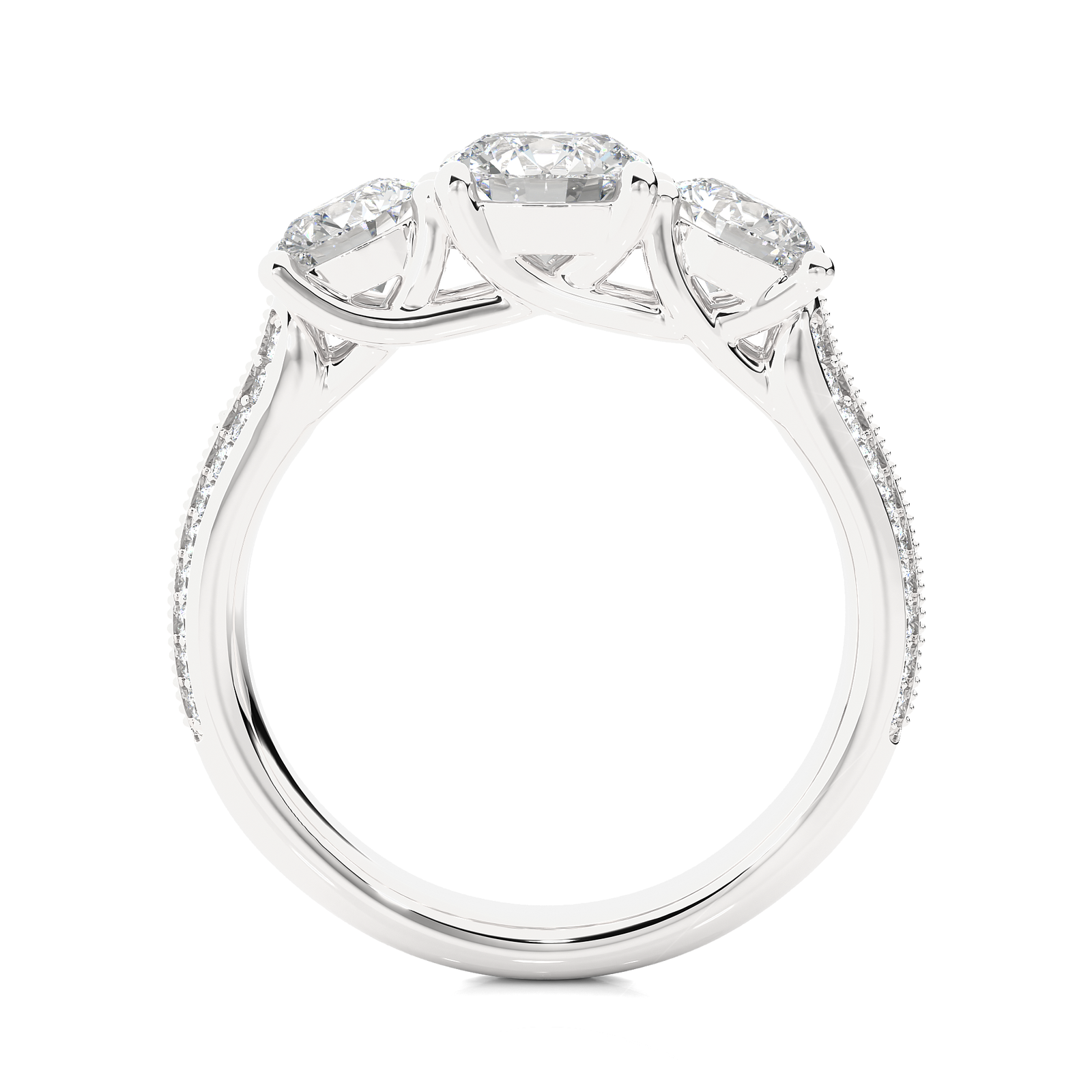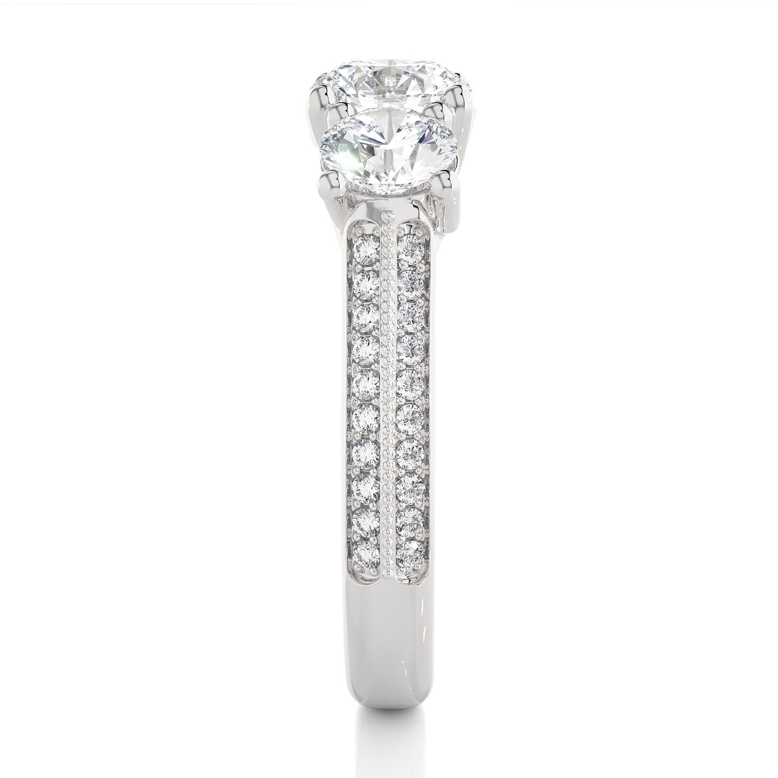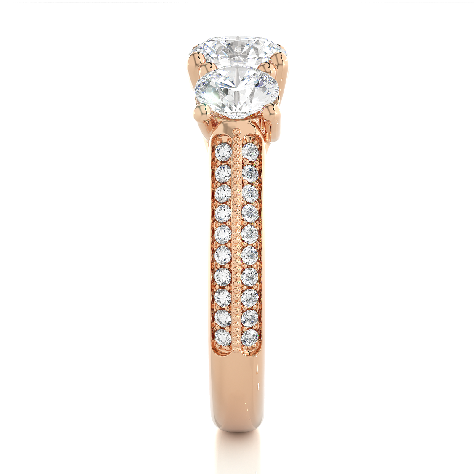 This exquisite rose gold three-stone ring. Featuring a brilliant round-cut center diamond flanked by two dazzling side stones, it is beautifully complemented by a double-row pave band for extra sparkle. A stunning symbol of your past, present, and future love—crafted for everlasting brilliance and romance.
