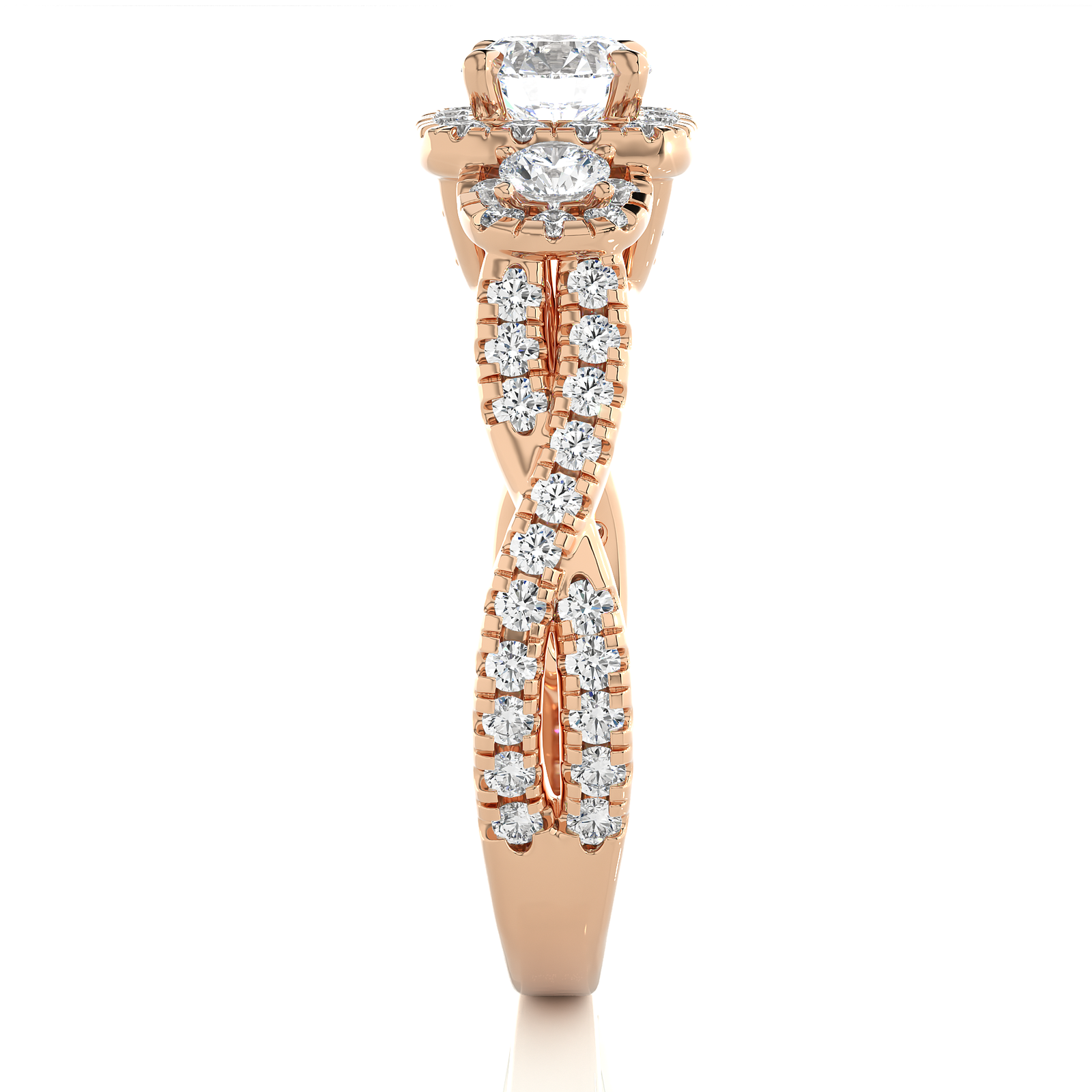 This three-stone ring features round diamonds framed by radiant halos for added brilliance. A twisted band encrusted with pavé diamonds enhances its luxurious charm. Symbolizing a love that transcends time, this dazzling piece is the perfect blend of romance, elegance, and everlasting commitment.