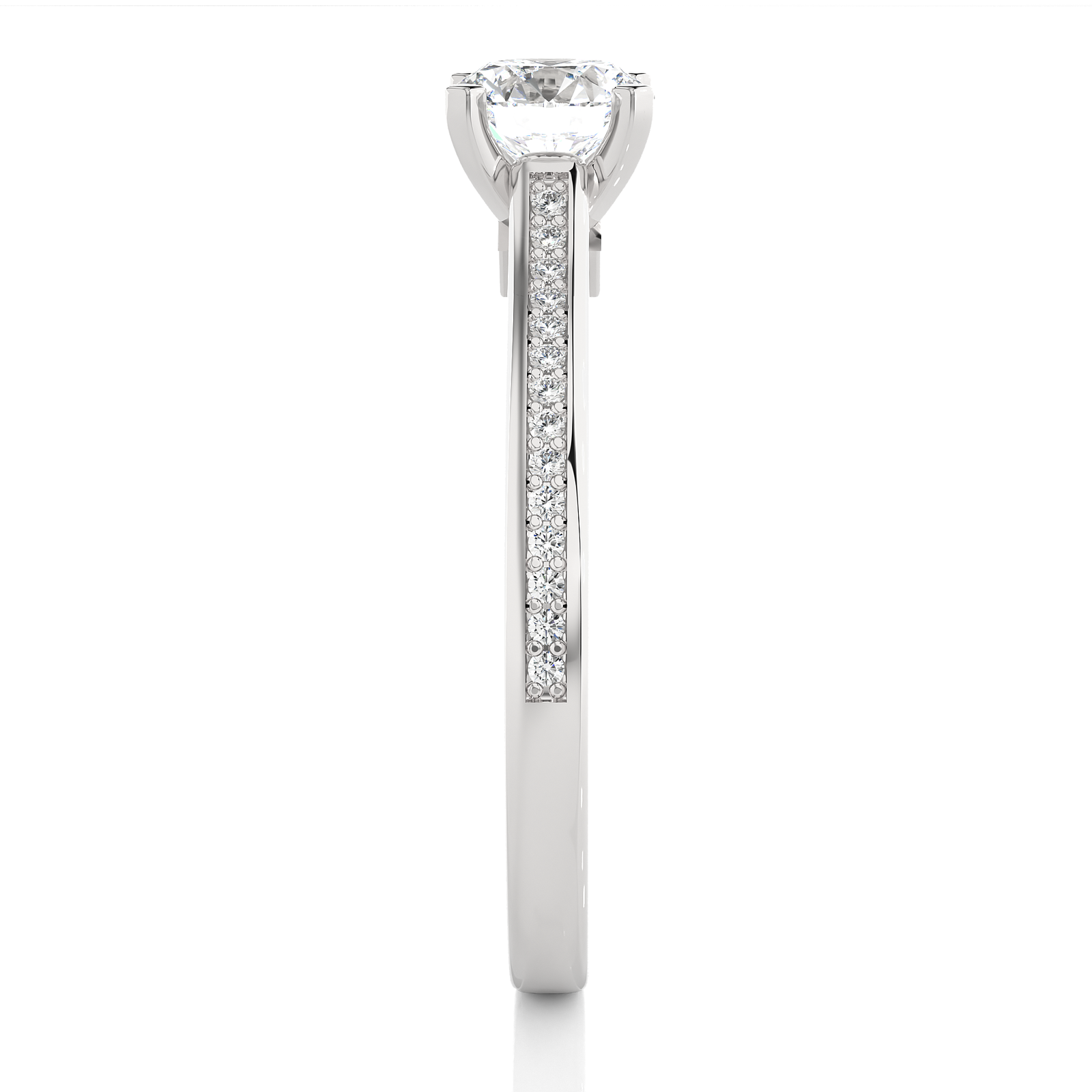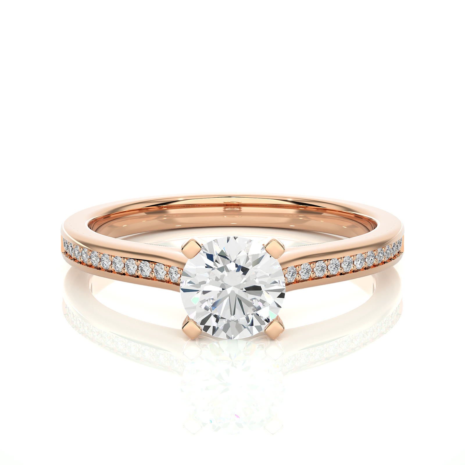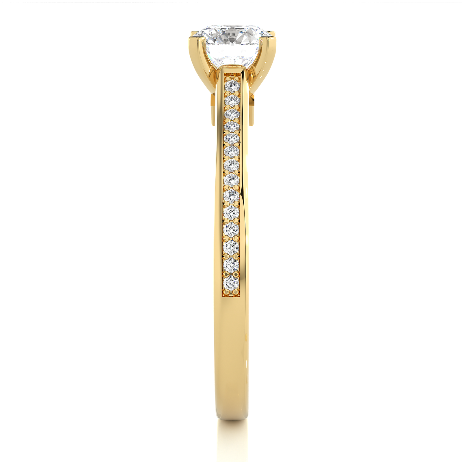 A stunning round-cut solitaire diamond is perfectly set on a classic yellow gold band, adorned with a row of pavé-set diamonds. This elegant ring captures timeless beauty and sophistication, making it the perfect choice for a heartfelt proposal or a luxurious personal statement. Designed to sparkle forever.