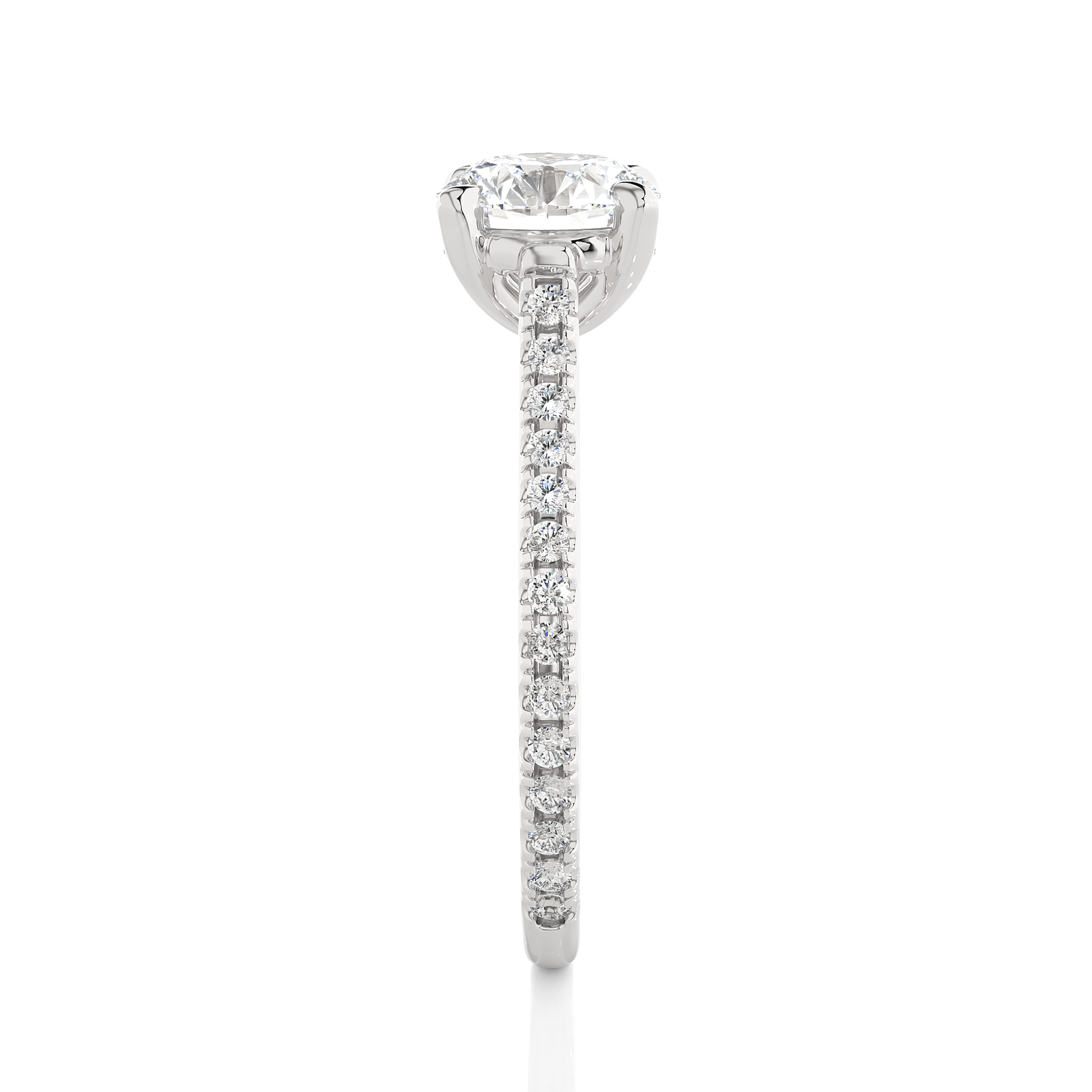 This graceful solid gold engagement ring features a stunning round-cut center stone, elevated by a secure prong setting for maximum brilliance. The slender band is adorned with pavé-set diamonds, adding a continuous sparkle. A timeless and romantic design, perfect for symbolizing everlasting love with elegance, beauty, and sophisticated charm.