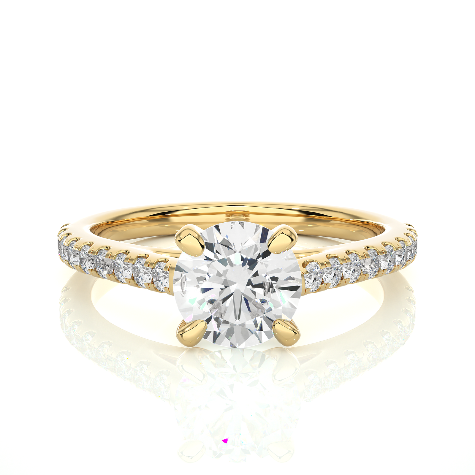 This gold engagement ring features a brilliant round-cut center stone held by a classic four-prong setting. The slender band is adorned with pavé-set diamonds, adding a continuous sparkle. A timeless and elegant design, perfect for expressing everlasting love with grace, beauty, and enduring sophistication.