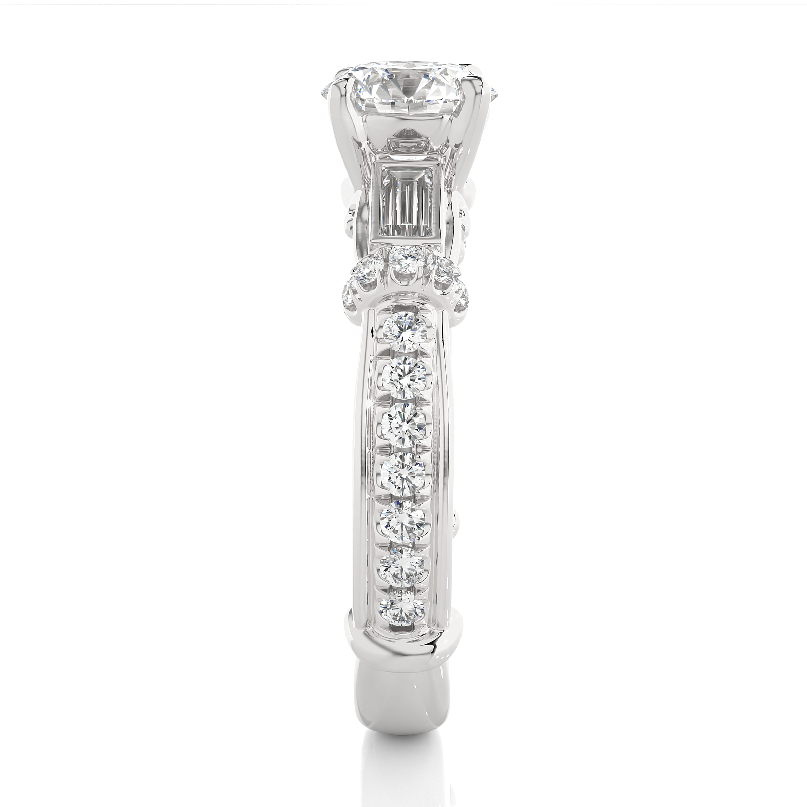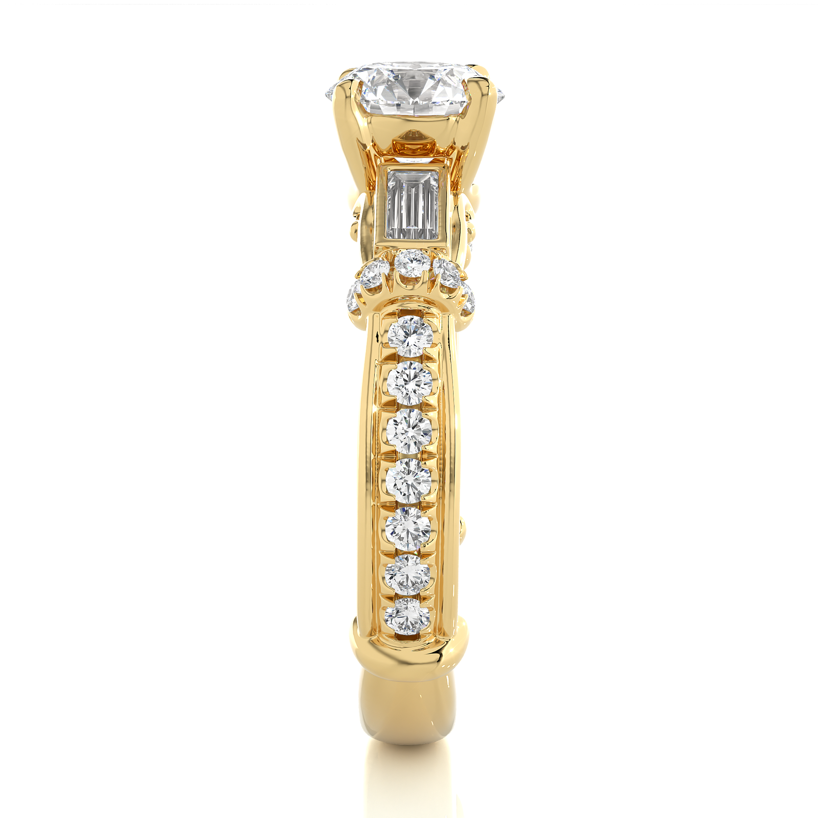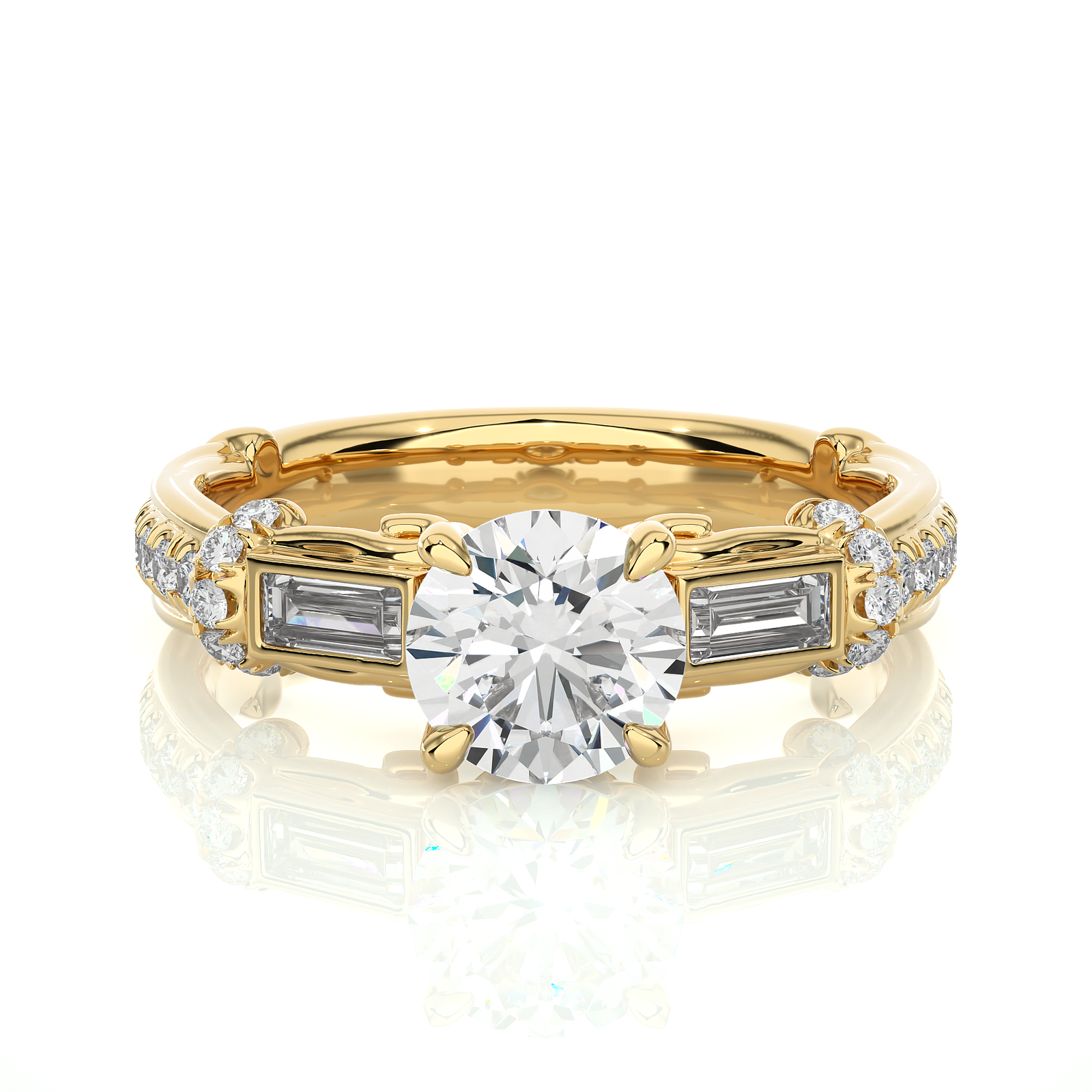 A stunning blend of modern elegance and timeless charm, this solid gold ring features a brilliant round center diamond. Flanked by sleek baguette-cut diamonds and sparkling pavé accents, the design radiates sophistication and luxury. A perfect choice for those who appreciate bold beauty with refined, intricate craftsmanship.